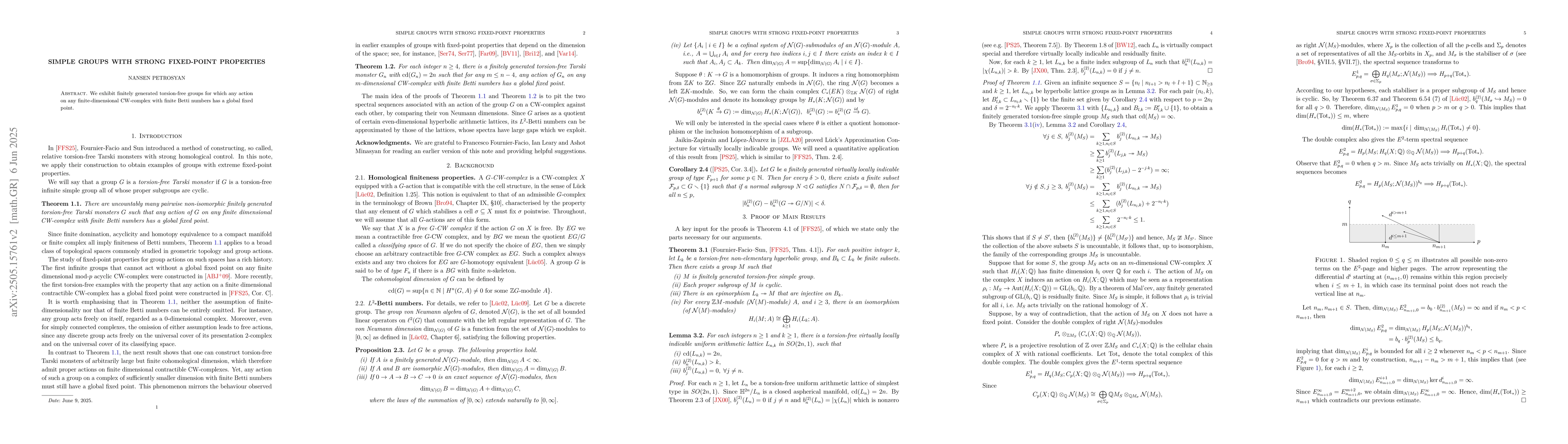 The research methodology involves exhibiting finitely generated torsion-free groups and analyzing their actions on finite-dimensional CW-complexes with finite Betti numbers to establish global fixed-point properties.