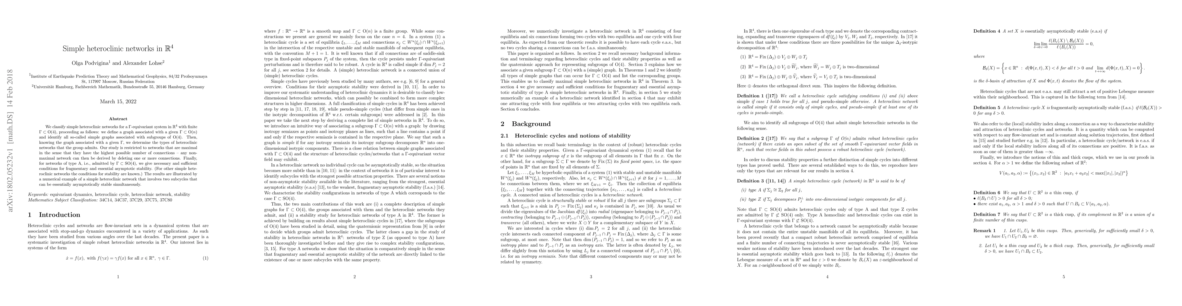 This paper classifies simple heteroclinic networks in ${\mathbb R}^4$ for $\Gamma$-equivariant systems, identifying maximal networks and providing conditions for stability for networks of type A. Necessary and sufficient conditions for fragmentary and essential asymptotic stability are given, illustrated by a numerical example.