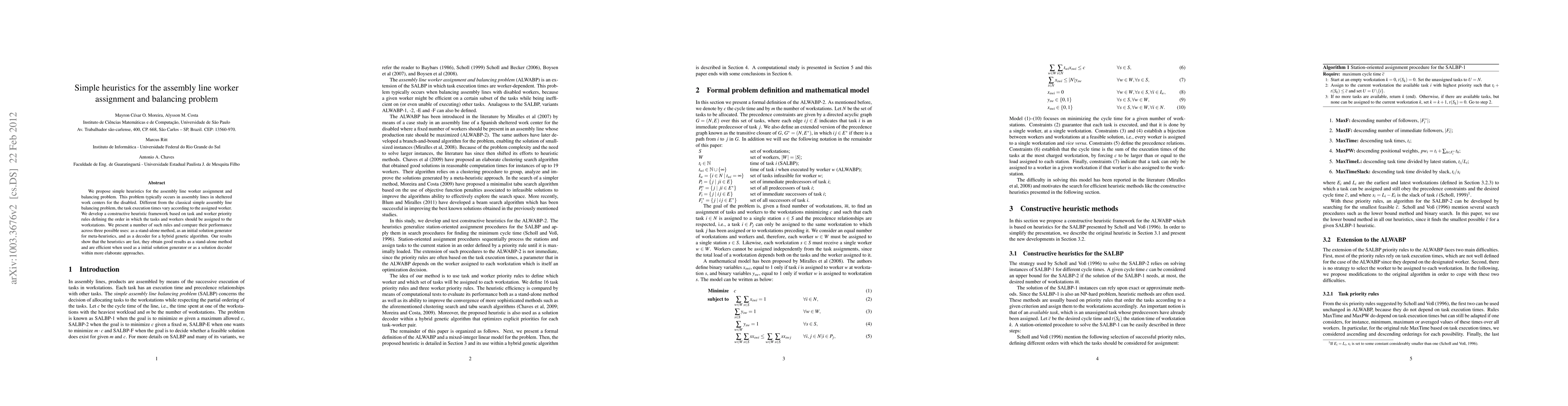 We propose simple heuristics for the assembly line worker assignment and balancing problem. This problem typically occurs in assembly lines in sheltered work centers for the disabled. Different from the classical simple assembly line balancing problem, the task execution times vary according to the assigned worker. We develop a constructive heuristic framework based on task and worker priority rules defining the order in which the tasks and workers should be assigned to the workstations. We present a number of such rules and compare their performance across three possible uses: as a stand-alone method, as an initial solution generator for meta-heuristics, and as a decoder for a hybrid genetic algorithm. Our results show that the heuristics are fast, they obtain good results as a stand-alone method and are efficient when used as a initial solution generator or as a solution decoder within more elaborate approaches.