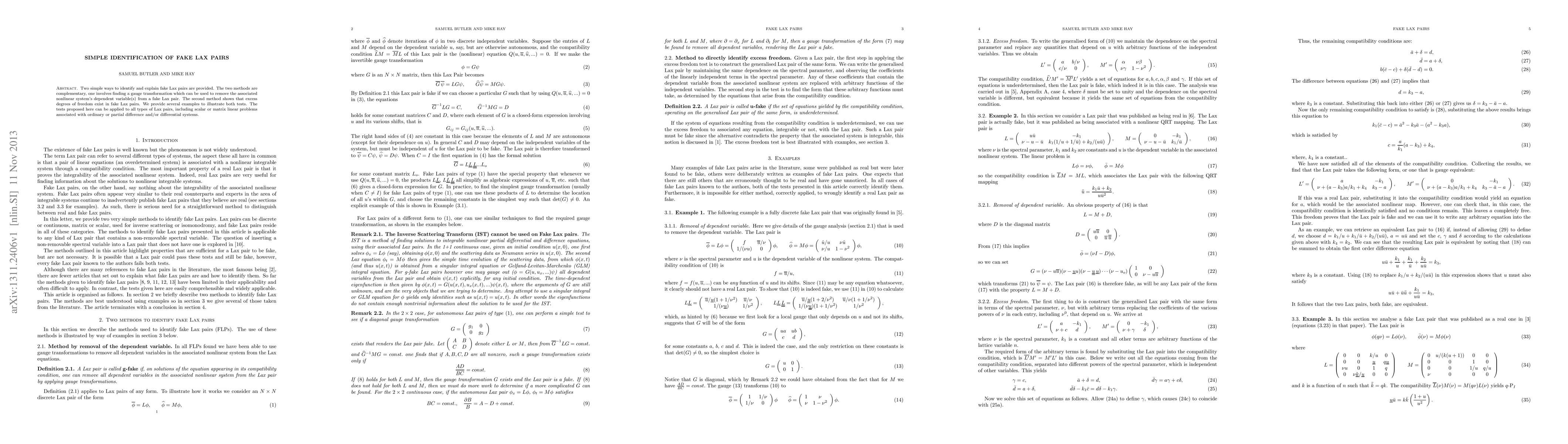 Two simple ways to identify and explain fake Lax pairs are provided. The two methods are complementary, one involves finding a gauge transformation which can be used to remove the associated nonlinear system's dependent variable(s) from a fake Lax pair. The second method shows that excess degrees of freedom exist in fake Lax pairs. We provide several examples to illustrate both tests. The tests proposed here can be applied to all types of Lax pairs, including scalar or matrix linear problems associated with ordinary or partial difference and/or differential systems.