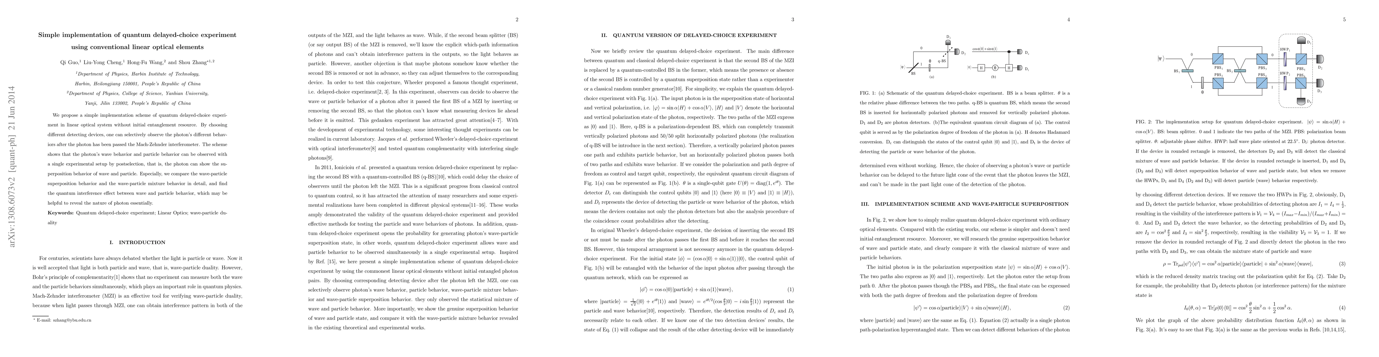This paper presents a straightforward quantum delayed-choice experiment using linear optical components, allowing observation of a photon’s wave and particle behaviors postselection. The study reveals a quantum interference effect between wave and particle behavior, offering insights into the fundamental nature of photons.