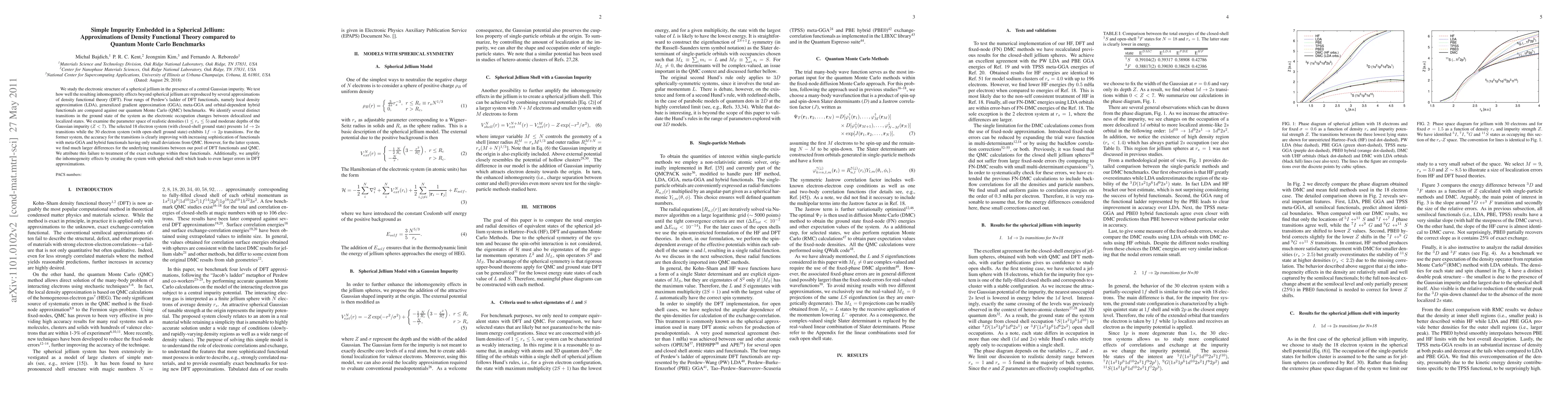 We study the electronic structure of a spherical jellium in the presence of a central Gaussian impurity. We test how well the resulting inhomogeneity effects beyond spherical jellium are reproduced by several approximations of density functional theory (DFT). Four rungs of Perdew's ladder of DFT functionals, namely local density approximation (LDA), generalized gradient approximation (GGA), meta-GGA and orbital-dependent hybrid functionals are compared against our quantum Monte Carlo (QMC) benchmarks. We identify several distinct transitions in the ground state of the system as the electronic occupation changes between delocalized and localized states. We examine the parameter space of realistic densities ($1 \le r_s\le 5$) and moderate depths of the Gaussian impurity ($Z<7$). The selected 18 electron system (with closed-shell ground state) presents $1d \to 2s$ transitions while the 30 electron system (with open-shell ground state) exhibits $1f \to 2p$ transitions. For the former system, the accuracy for the transitions is clearly improving with increasing sophistication of functionals with meta-GGA and hybrid functionals having only small deviations from QMC. However, for the latter system, we find much larger differences for the underlying transitions between our pool of DFT functionals and QMC. We attribute this failure to treatment of the exact exchange within these functionals. Additionally, we amplify the inhomogeneity effects by creating the system with spherical shell which leads to even larger errors in DFT approximations.