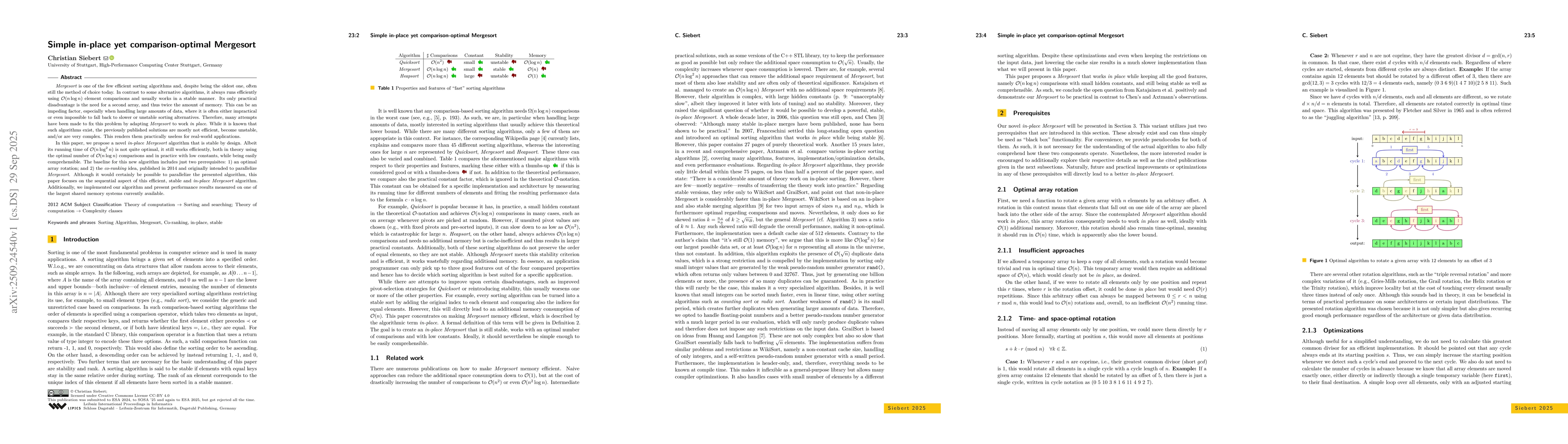 The work introduces a novel approach to in-place merging using co-ranking to determine rotation offsets, enabling stable sorting with minimal additional memory and efficient handling of large datasets.