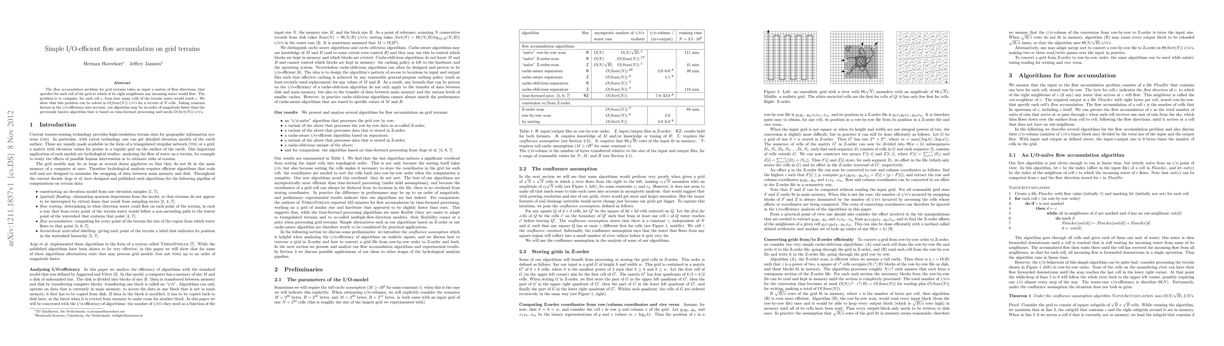 A new algorithm solves flow accumulation on grid terrains in O(scan(N)) I/Os, potentially an order of magnitude faster than previous methods.