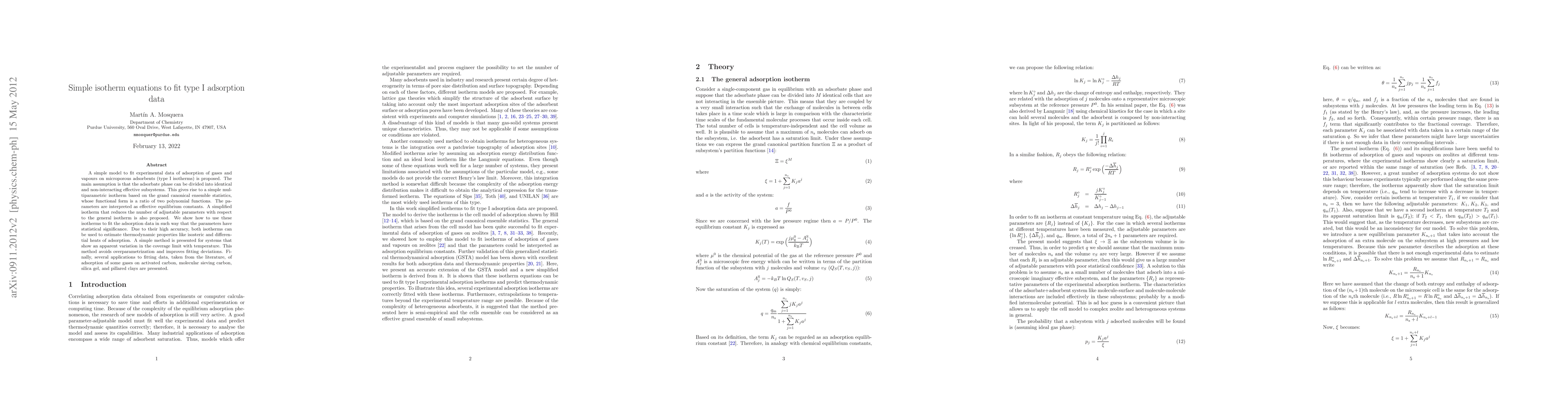 This paper proposes simple isotherm models to accurately fit type I adsorption data for gases and vapors on microporous adsorbents, using a multiparametric approach based on grand canonical ensemble statistics. The models are shown to effectively estimate thermodynamic properties and avoid overparametrization, demonstrated through applications to various adsorbents.