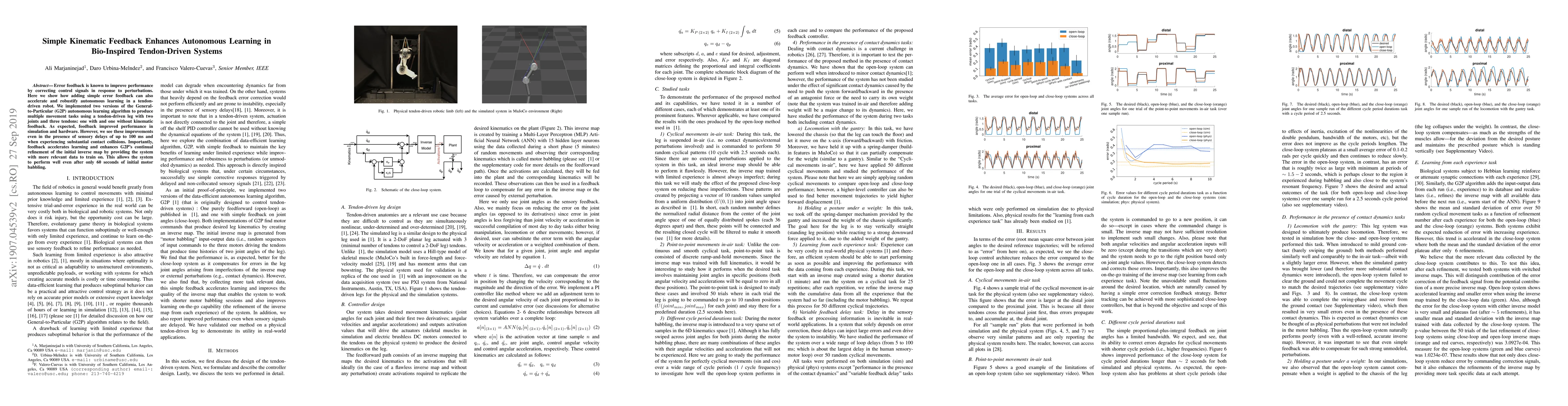 Error feedback is known to improve performance by correcting control signals in response to perturbations. Here we show how adding simple error feedback can also accelerate and robustify autonomous learning in a tendon-driven robot. We implemented two versions of the General-to-Particular (G2P) autonomous learning algorithm to produce multiple movement tasks using a tendon-driven leg with two joints and three tendons: one with and one without kinematic feedback. As expected, feedback improved performance in simulation and hardware. However, we see these improvements even in the presence of sensory delays of up to 100 ms and when experiencing substantial contact collisions. Importantly, feedback accelerates learning and enhances G2P's continual refinement of the initial inverse map by providing the system with more relevant data to train on. This allows the system to perform well even after only 60 seconds of initial motor babbling.