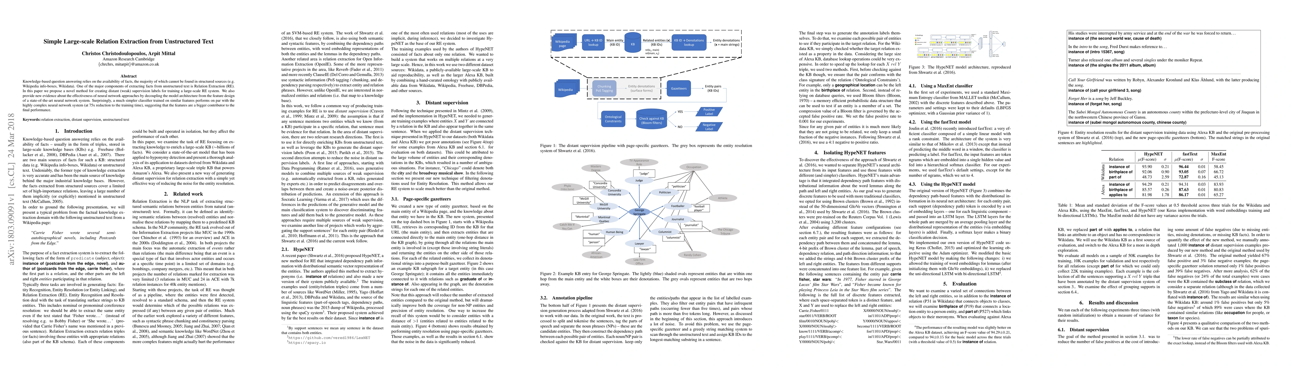 Researchers propose a novel method for training large-scale Relation Extraction systems on unstructured text using distant supervision labels, finding that simpler classifiers can perform similarly to complex neural networks.