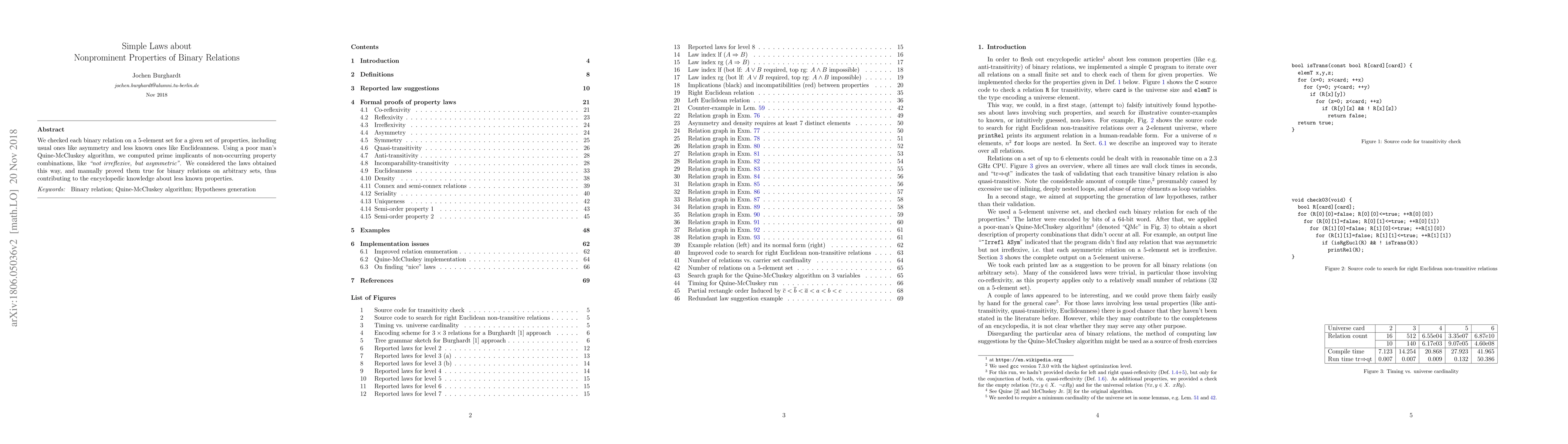 We checked each binary relation on a 5-element set for a given set of properties, including usual ones like asymmetry and less known ones like Euclideanness. Using a poor man's Quine-McCluskey algorithm, we computed prime implicants of non-occurring property combinations, like "not irreflexive, but asymmetric". We considered the non-trivial laws obtained this way, and manually proved them true for binary relations on arbitrary sets, thus contributing to the encyclopedic knowledge about less known properties.