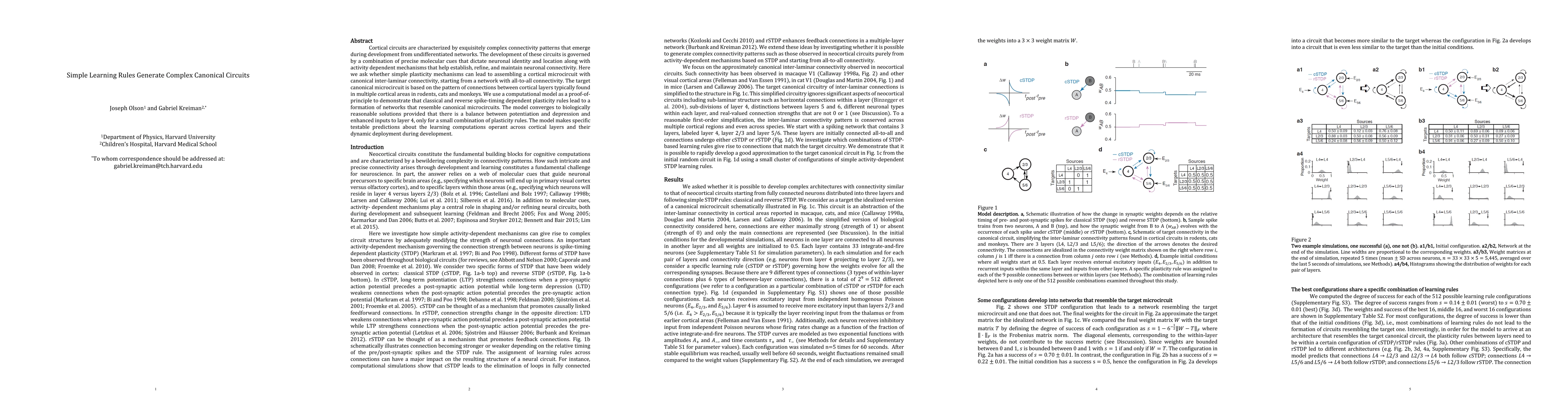 Cortical circuits are characterized by exquisitely complex connectivity patterns that emerge during development from undifferentiated networks. The development of these circuits is governed by a combination of precise molecular cues that dictate neuronal identity and location along with activity dependent mechanisms that help establish, refine, and maintain neuronal connectivity. Here we ask whether simple plasticity mechanisms can lead to assembling a cortical microcircuit with canonical inter-laminar connectivity, starting from a network with all-to-all connectivity. The target canonical microcircuit is based on the pattern of connections between cortical layers typically found in multiple cortical areas in rodents, cats and monkeys. We use a computational model as a proof-of-principle to demonstrate that classical and reverse spike-timing dependent plasticity rules lead to a formation of networks that resemble canonical microcircuits. The model converges to biologically reasonable solutions provided that there is a balance between potentiation and depression and enhanced inputs to layer 4, only for a small combination of plasticity rules. The model makes specific testable predictions about the learning computations operant across cortical layers and their dynamic deployment during development.