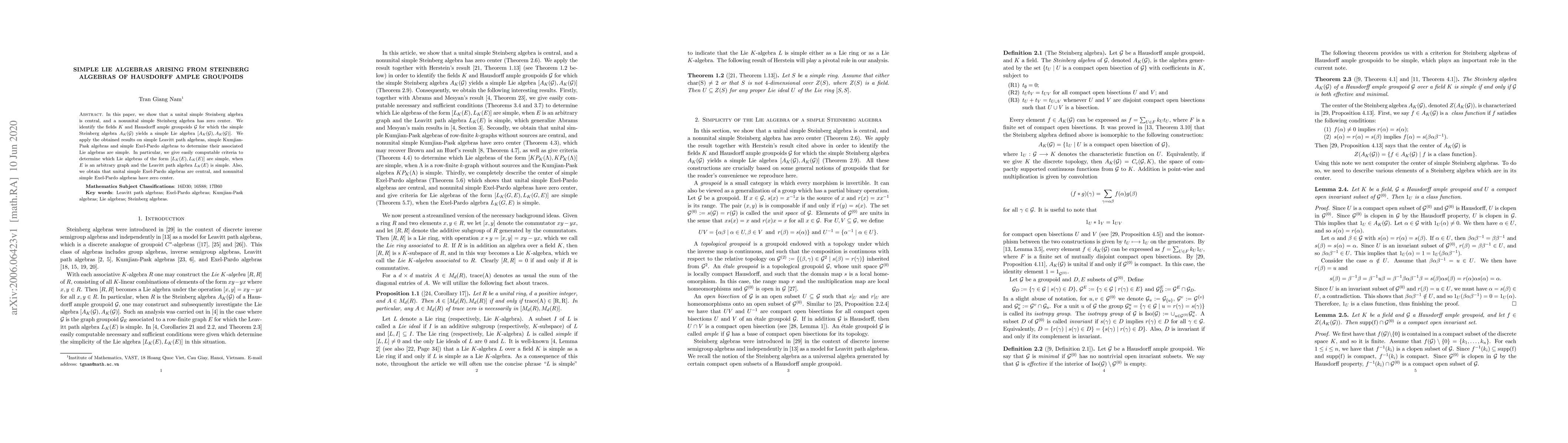 This paper demonstrates that simple Steinberg algebras yield simple Lie algebras under specific conditions, and provides criteria for determining when these algebras are central or have zero center. It applies these findings to simple Leavitt path algebras, Kumjian-Pask algebras, and Exel-Pardo algebras to establish their associated Lie algebras as simple.