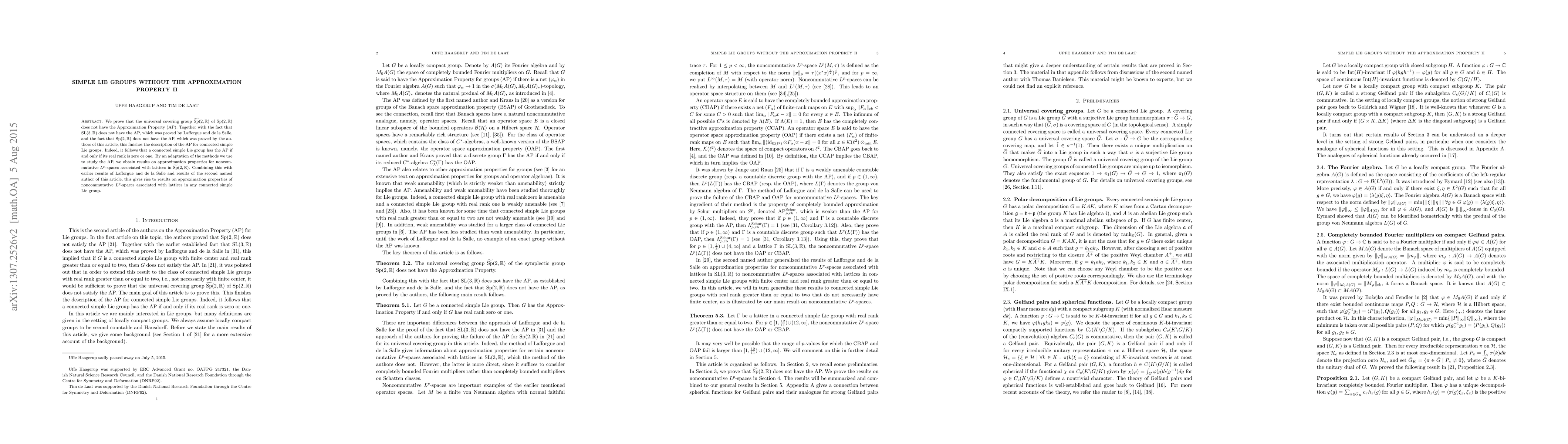 We prove that the universal covering group $\widetilde{\mathrm{Sp}}(2,\mathbb{R})$ of $\mathrm{Sp}(2,\mathbb{R})$ does not have the Approximation Property (AP). Together with the fact that $\mathrm{SL}(3,\mathbb{R})$ does not have the AP, which was proved by Lafforgue and de la Salle, and the fact that $\mathrm{Sp}(2,\mathbb{R})$ does not have the AP, which was proved by the authors of this article, this finishes the description of the AP for connected simple Lie groups. Indeed, it follows that a connected simple Lie group has the AP if and only if its real rank is zero or one. By an adaptation of the methods we use to study the AP, we obtain results on approximation properties for noncommutative $L^p$-spaces associated with lattices in $\widetilde{\mathrm{Sp}}(2,\mathbb{R})$. Combining this with earlier results of Lafforgue and de la Salle and results of the second named author of this article, this gives rise to results on approximation properties of noncommutative $L^p$-spaces associated with lattices in any connected simple Lie group.