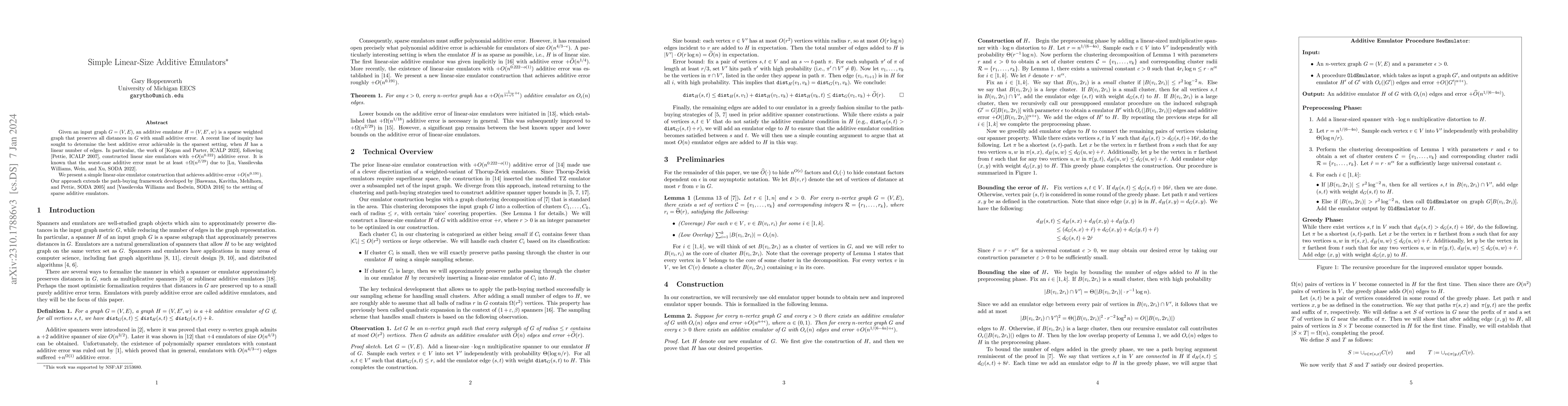 This paper presents a simple linear-size additive emulator for graphs that achieves an additive error of $+O(n^{0.191})$, improving upon previous results. The construction extends the path-buying framework to enhance the sparsest setting with better error bounds.