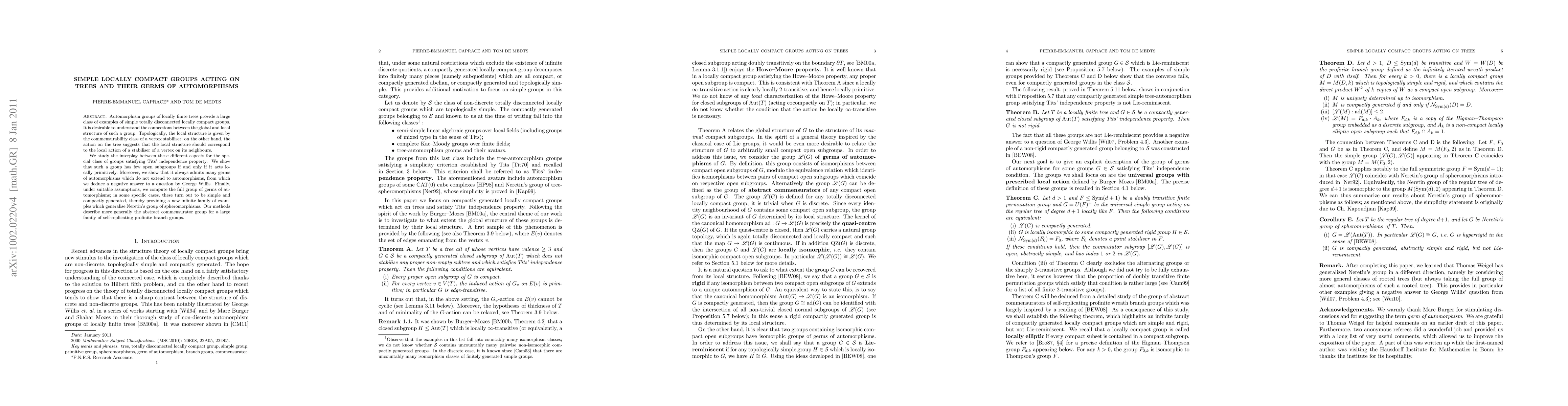 The paper studies the connections between global and local structure of simple totally disconnected locally compact groups acting on trees, focusing on groups with Tits' independence property, and finds that such groups have few open subgroups if they act locally primitively and admit many germs of automorphisms that do not extend to full automorphisms.