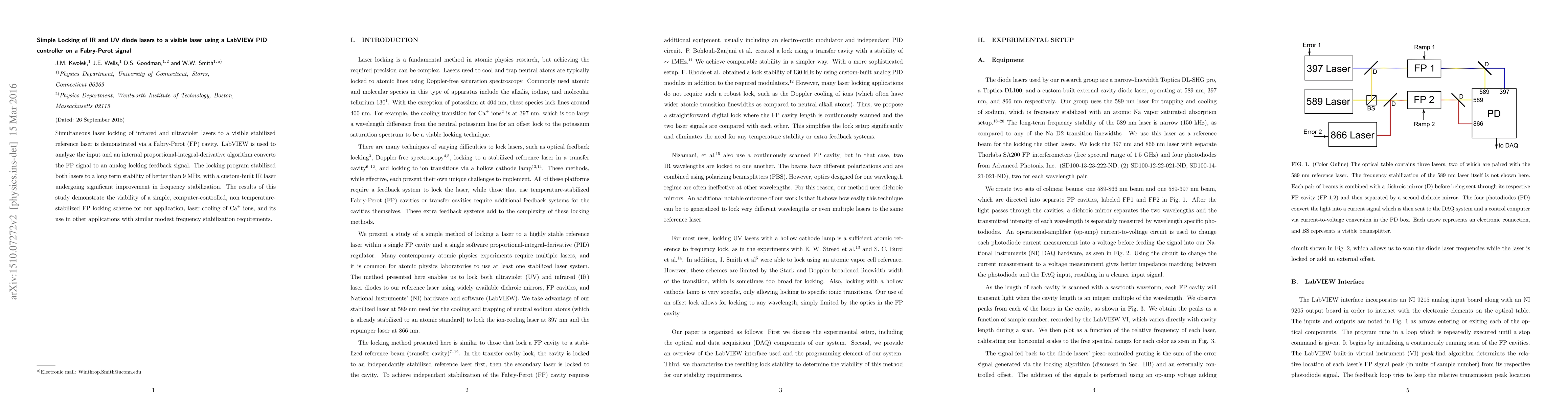 Simultaneous laser locking of IR and UV lasers to a visible stabilized reference laser is demonstrated via a Fabry-Perot cavity. LabVIEW is used to analyze the input and an internal PID algorithm converts the Fabry-Perot signal to an analog locking feedback signal. The locking program stabilized both lasers to a long term stability of better than 9 MHz, with a custom-built IR laser undergoing significant improvement in frequency stabilization. The results of this study demonstrate the viability of a simple computer-controlled, non temperature-stabilized Fabry-Perot locking scheme for our application, laser cooling of Ca+ ions, and its use in other applications with similar modest frequency stabilization requirements.