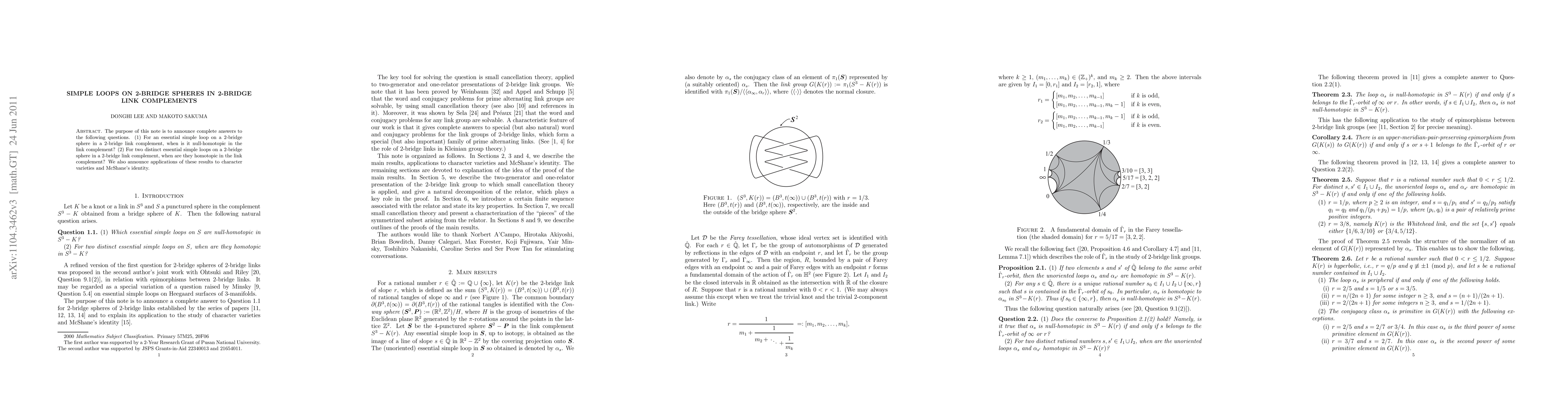 The purpose of this note is to announce complete answers to the following questions. (1) For an essential simple loop on a 2-bridge sphere in a 2-bridge link complement, when is it null-homotopic in the link complement? (2) For two distinct essential simple loops on a 2-bridge sphere in a 2-bridge link complement, when are they homotopic in the link complement? We also announce applications of these results to character varieties and McShane's identity.