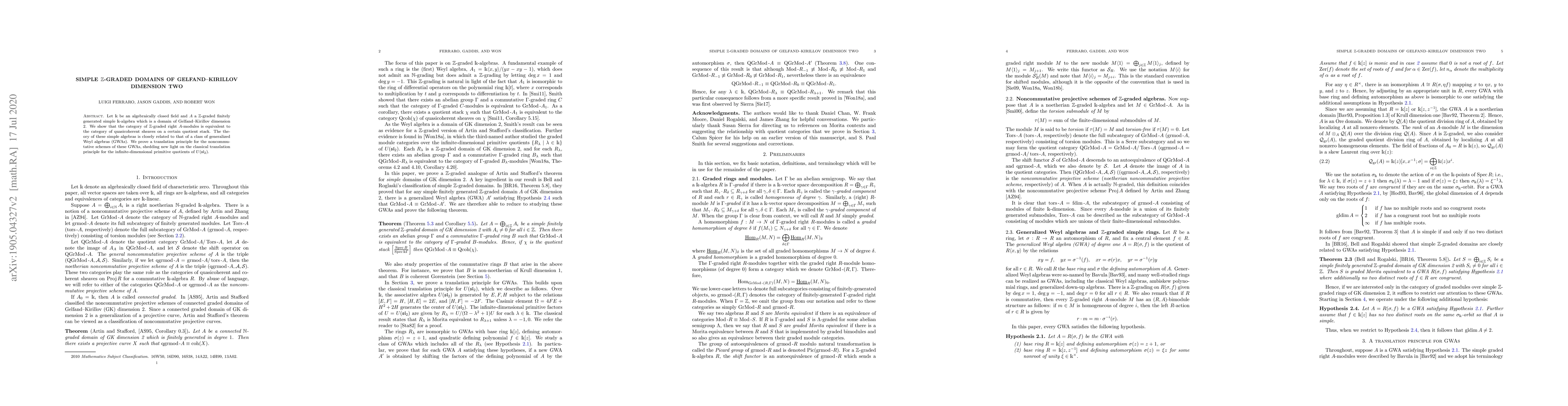 Let $k$ be an algebraically closed field and $A$ a $\mathbb{Z}$-graded finitely generated simple $k$-algebra which is a domain of Gelfand-Kirillov dimension 2. We show that the category of $\mathbb{Z}$-graded right $A$-modules is equivalent to the category of quasicoherent sheaves on a certain quotient stack. The theory of these simple algebras is closely related to that of a class of generalized Weyl algebras (GWAs). We prove a translation principle for the noncommutative schemes of these GWAs, shedding new light on the classical translation principle for the infinite-dimensional primitive quotients of $U(\mathfrak{sl}_2)$.