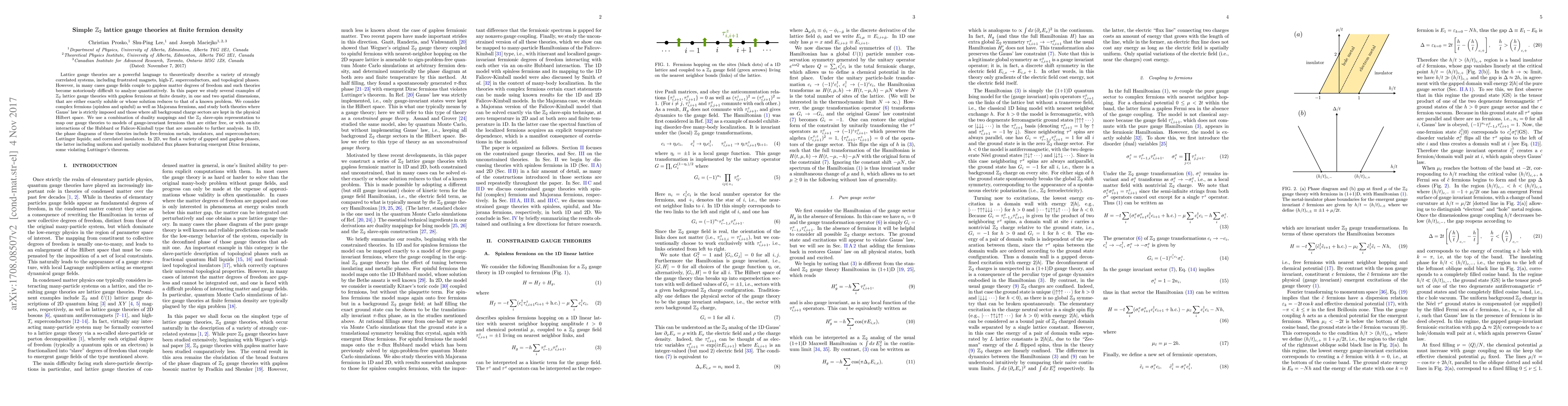 This paper investigates $\mathbb{Z}_2$ lattice gauge theories with gapless fermions at finite density, employing duality and $\mathbb{Z}_2$ slave-spin representations to simplify analysis. It reveals various phases in 1D and 2D, including metals, insulators, superconductors, Luttinger liquids, and novel flux phases with emergent Dirac fermions.