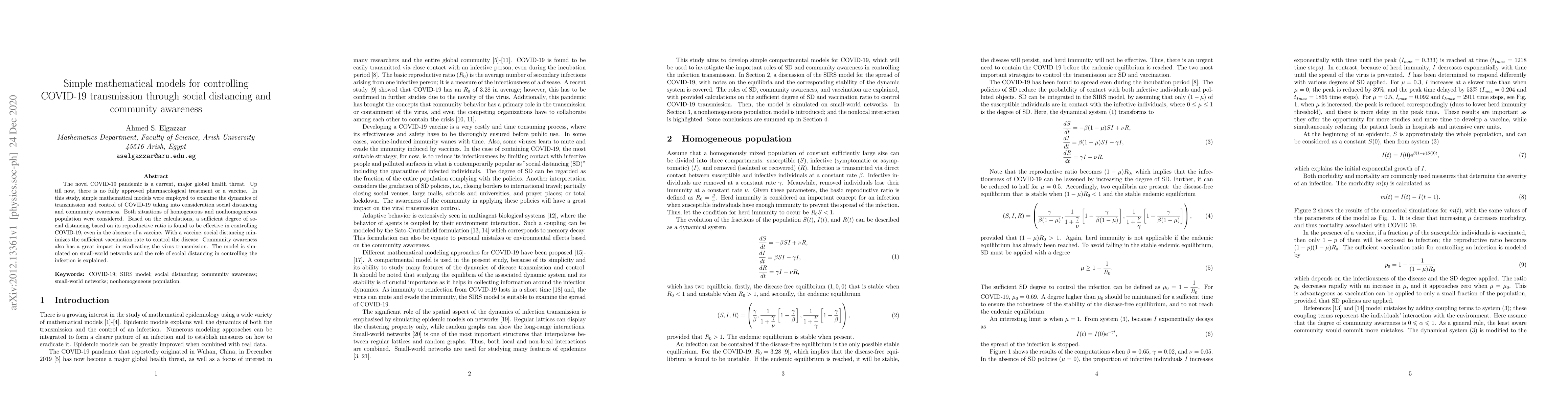The novel COVID-19 pandemic is a current, major global health threat. Up till now, there is no fully approved pharmacological treatment or a vaccine. In this study, simple mathematical models were employed to examine the dynamics of transmission and control of COVID-19 taking into consideration social distancing and community awareness. Both situations of homogeneous and nonhomogeneous population were considered. Based on the calculations, a sufficient degree of social distancing based on its reproductive ratio is found to be effective in controlling COVID-19, even in the absence of a vaccine. With a vaccine, social distancing minimizes the sufficient vaccination rate to control the disease. Community awareness also has a great impact in eradicating the virus transmission. The model is simulated on small-world networks and the role of social distancing in controlling the infection is explained.