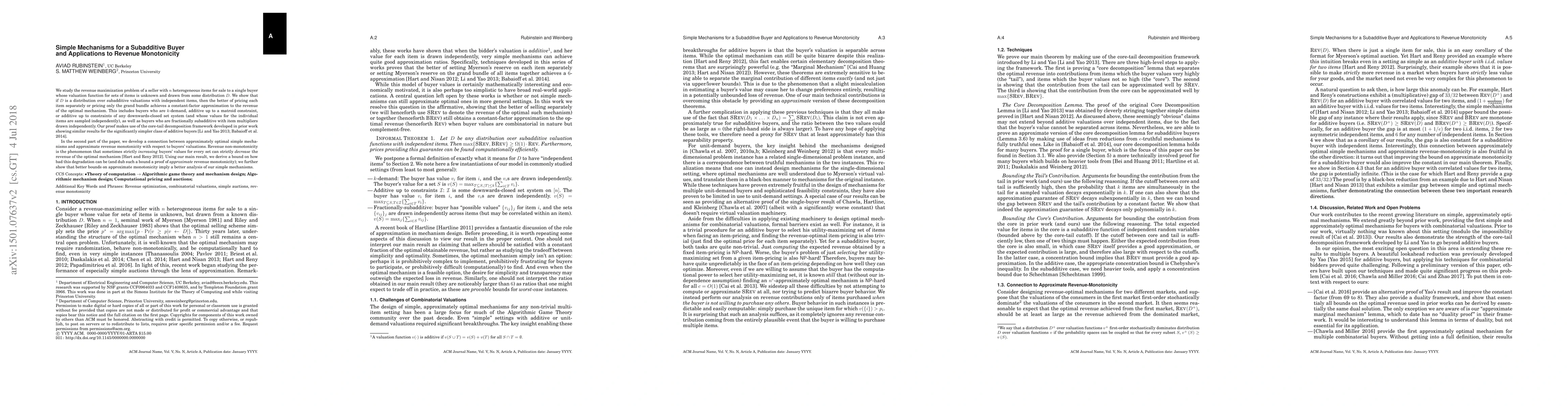 We study the revenue maximization problem of a seller with n heterogeneous items for sale to a single buyer whose valuation function for sets of items is unknown and drawn from some distribution D. We show that if D is a distribution over subadditive valuations with independent items, then the better of pricing each item separately or pricing only the grand bundle achieves a constant-factor approximation to the revenue of the optimal mechanism. This includes buyers who are k-demand, additive up to a matroid constraint, or additive up to constraints of any downwards-closed set system (and whose values for the individual items are sampled independently), as well as buyers who are fractionally subadditive with item multipliers drawn independently. Our proof makes use of the core-tail decomposition framework developed in prior work showing similar results for the significantly simpler class of additive buyers [LY13, BILW14]. In the second part of the paper, we develop a connection between approximately optimal simple mechanisms and approximate revenue monotonicity with respect to buyers' valuations. Revenue non-monotonicity is the phenomenon that sometimes strictly increasing buyers' values for every set can strictly decrease the revenue of the optimal mechanism [HR12]. Using our main result, we derive a bound on how bad this degradation can be (and dub such a bound a proof of approximate revenue monotonicity); we further show that better bounds on approximate monotonicity imply a better analysis of our simple mechanisms.