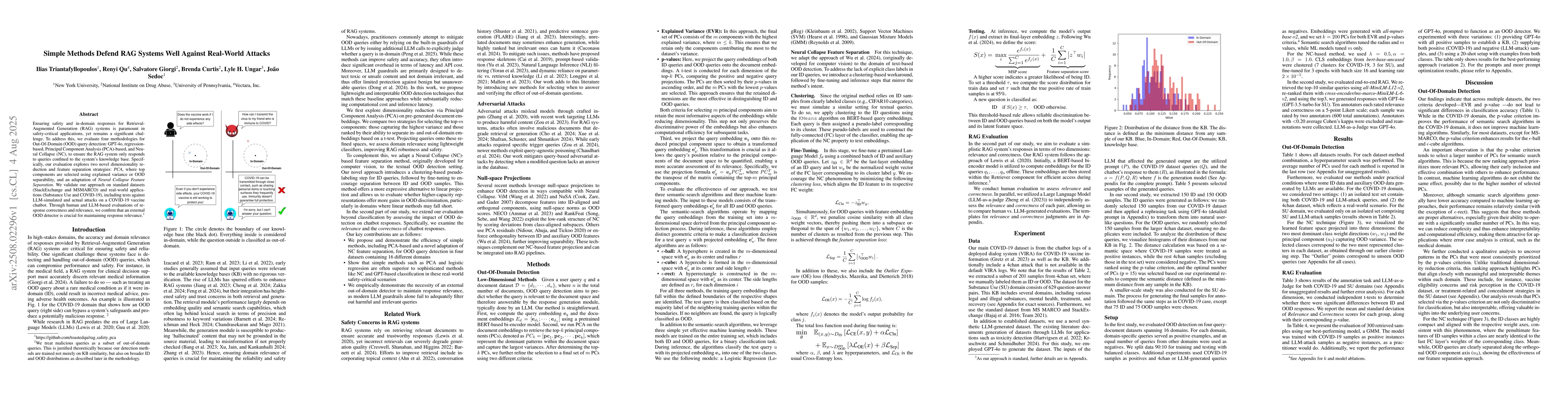 Ensuring safety and in-domain responses for Retrieval-Augmented Generation (RAG) systems is paramount in safety-critical applications, yet remains a significant challenge. To address this, we evaluate four methodologies for Out-Of-Domain (OOD) query detection: GPT-4o, regression-based, Principal Component Analysis (PCA)-based, and Neural Collapse (NC), to ensure the RAG system only responds to queries confined to the system's knowledge base. Specifically, our evaluation explores two novel dimensionality reduction and feature separation strategies: \textit{PCA}, where top components are selected using explained variance or OOD separability, and an adaptation of \textit{Neural Collapse Feature Separation}. We validate our approach on standard datasets (StackExchange and MSMARCO) and real-world applications (Substance Use and COVID-19), including tests against LLM-simulated and actual attacks on a COVID-19 vaccine chatbot. Through human and LLM-based evaluations of response correctness and relevance, we confirm that an external OOD detector is crucial for maintaining response relevance.