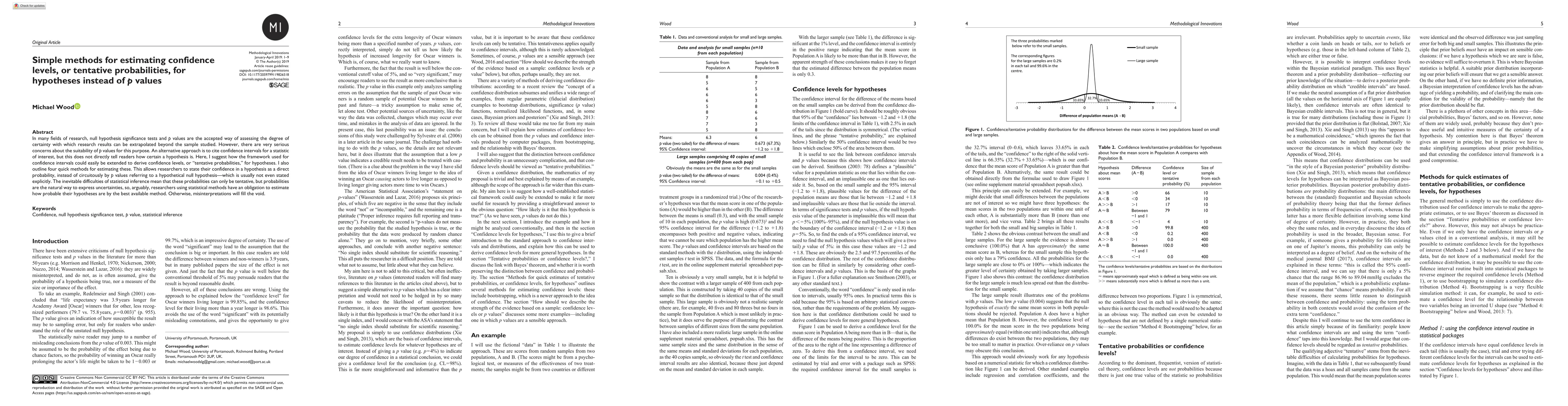 In many fields of research null hypothesis significance tests and p values are the accepted way of assessing the degree of certainty with which research results can be extrapolated beyond the sample studied. However, there are very serious concerns about the suitability of p values for this purpose. An alternative approach is to cite confidence intervals for a statistic of interest, but this does not directly tell readers how certain a hypothesis is. Here, I suggest how the framework used for confidence intervals could easily be extended to derive confidence levels, or "tentative probabilities", for hypotheses. I also outline four quick methods for estimating these. This allows researchers to state their confidence in a hypothesis as a direct probability, instead of circuitously by p values referring to an unstated, hypothetical null hypothesis. The inevitable difficulties of statistical inference mean that these probabilities can only be tentative, but probabilities are the natural way to express uncertainties, so, arguably, researchers using statistical methods have an obligation to estimate how probable their hypotheses are by the best available method. Otherwise misinterpretations will fill the void. Key words: Confidence, Null hypothesis significance test, p value, Statistical inference