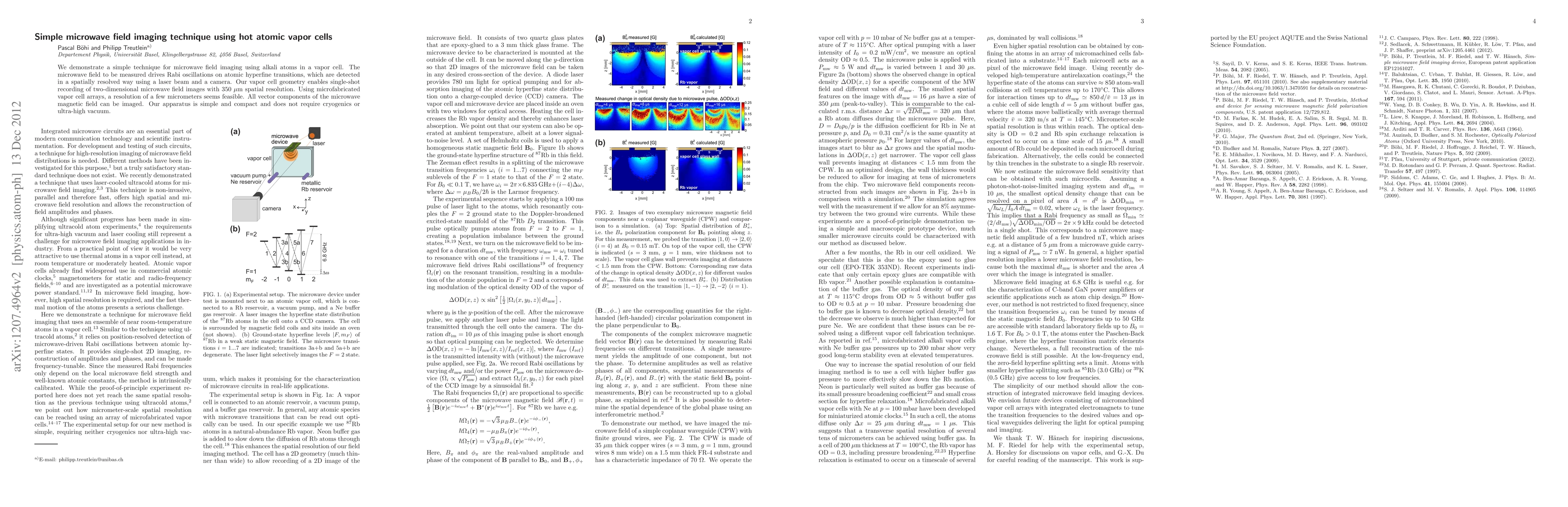 This paper presents a straightforward microwave field imaging technique utilizing alkali atoms in vapor cells, achieving 350 μm spatial resolution and enabling the detection of all vector components of the microwave magnetic field through Rabi oscillations detected with a laser and camera. The setup is simple, compact, and does not require cryogenics or ultra-high vacuum.