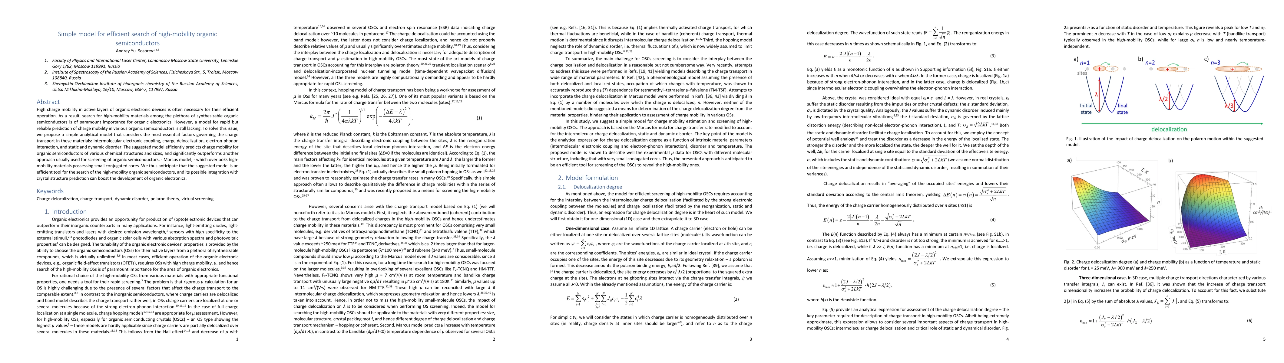 This paper proposes a simple analytical model to predict charge mobility in high-mobility organic semiconductors by considering key factors like electronic coupling and disorder. The new model outperforms the Marcus model by identifying materials with small conjugated cores, promising to enhance the search for optimal materials for organic electronics.