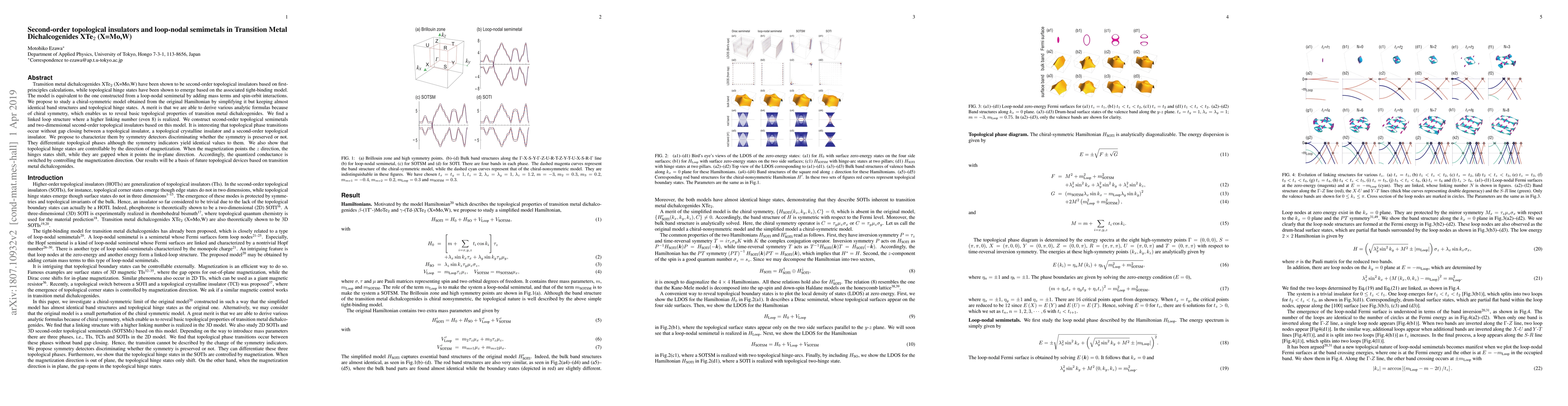 Transition metal dichalcogenides XTe$_{2}$ (X=Mo,W) have been shown to be second-order topological insulators based on first-principles calculations, while topological hinge states have been shown to emerge based on the associated tight-binding model. The model is equivalent to the one constructed from a loop-nodal semimetal by adding mass terms and spin-orbit interactions. We propose to study a chiral-symmetric model obtained from the original Hamiltonian by simplifying it but keeping almost identical band structures and topological hinge states. A merit is that we are able to derive various analytic formulas because of chiral symmetry, which enables us to reveal basic topological properties of transition metal dichalcogenides. We find a linked loop structure where a higher linking number (even 8) is realized. We construct second-order topological semimetals and two-dimensional second-order topological insulators based on this model. It is interesting that topological phase transitions occur without gap closing between a topological insulator, a topological crystalline insulator and a second-order topological insulator. We propose to characterize them by symmetry detectors discriminating whether the symmetry is preserved or not. They differentiate topological phases although the symmetry indicators yield identical values to them. We also show that topological hinge states are controllable by the direction of magnetization. When the magnetization points the $z$ direction, the hinges states shift, while they are gapped when it points the in-plane direction. Accordingly, the quantized conductance is switched by controlling the magnetization direction. Our results will be a basis of future topological devices based on transition metal dichalcogenides.