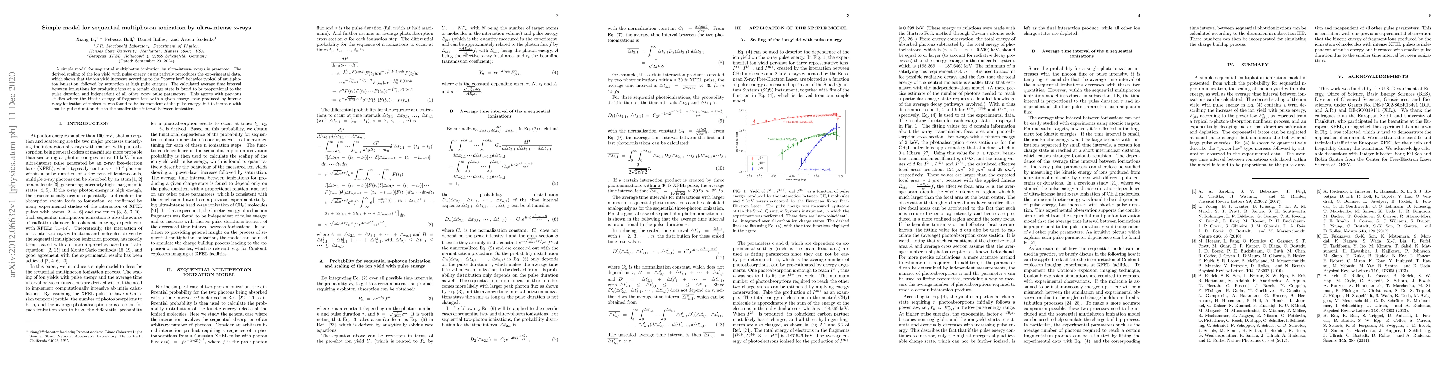 This paper presents a simple model for sequential multiphoton ionization by ultra-intense x-rays, showing that ion yield follows a "power law" and saturates at high pulse energies. The model also finds that the average time interval between ionizations is proportional to the pulse duration, aligning with previous findings on fragment ion kinetic energy.