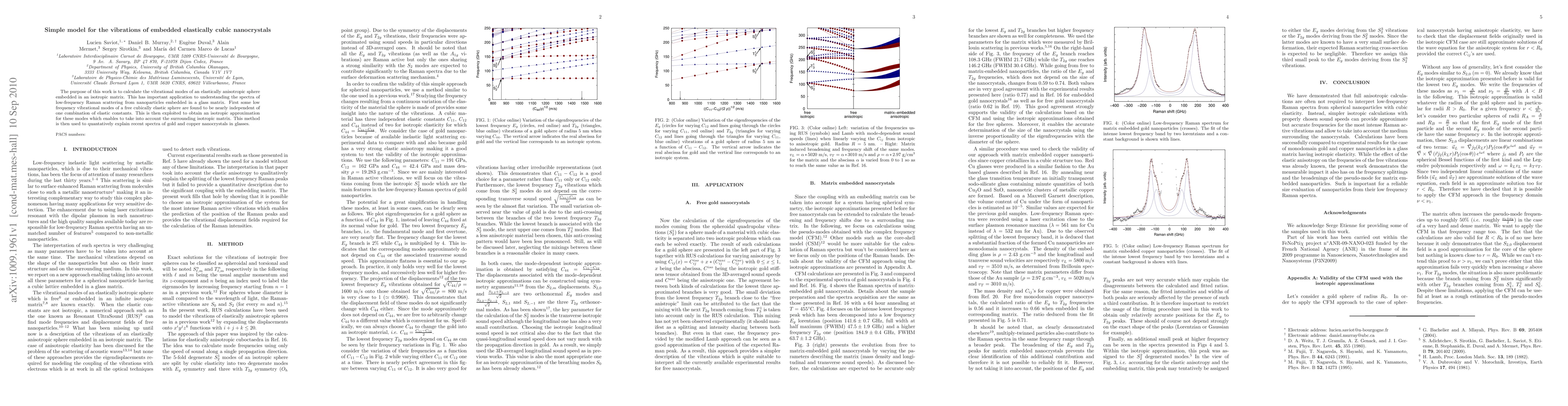 The purpose of this work is to calculate the vibrational modes of an elastically anisotropic sphere embedded in an isotropic matrix. This has important application to understanding the spectra of low-frequency Raman scattering from nanoparticles embedded in a glass matrix. First some low frequency vibrational modes of a free cubically elastic sphere are found to be nearly independent of one combination of elastic constants. This is then exploited to obtain an isotropic approximation for these modes which enables to take into account the surrounding isotropic matrix. This method is then used to quantatively explain recent spectra of gold and copper nanocrystals in glasses.