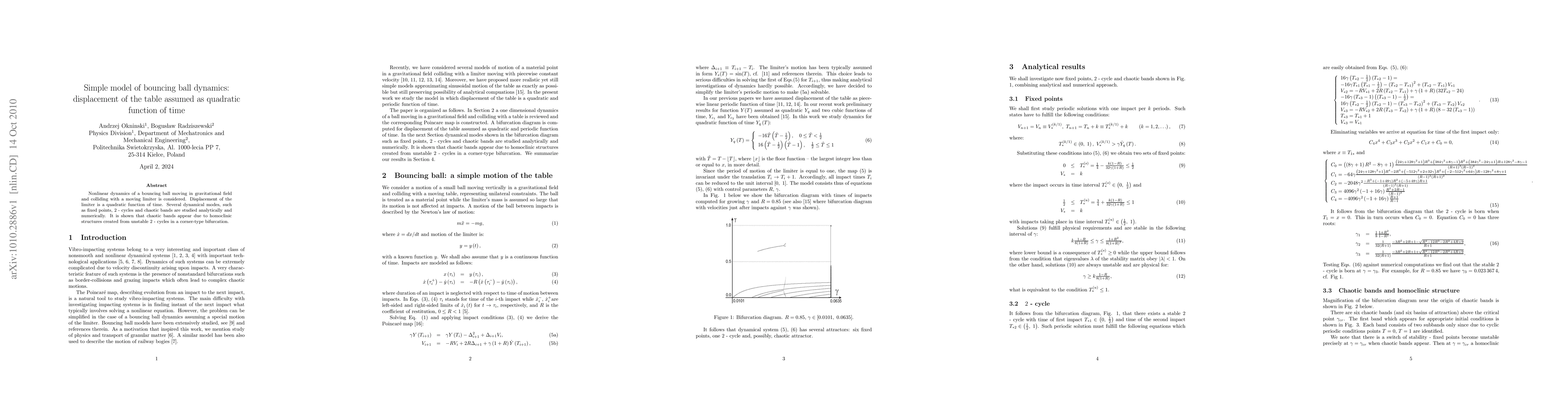 This paper studies the nonlinear dynamics of a bouncing ball in a gravitational field with a moving limiter whose displacement is quadratic in time. It analyzes various dynamical modes, including fixed points, 2-cycles, and chaotic bands, revealing that chaotic behavior emerges from unstable 2-cycles in a corner-type bifurcation.