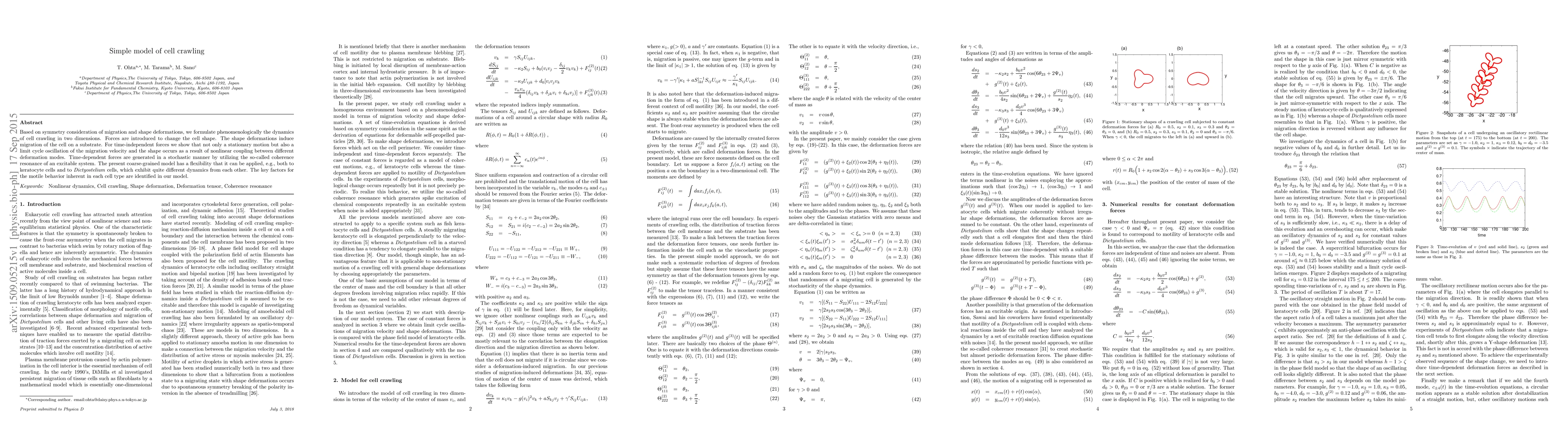Based on symmetry consideration of migration and shape deformations, we formulate phenomenologically the dynamics of cell crawling in two dimensions. Forces are introduced to change the cell shape. The shape deformations induce migration of the cell on a substrate. For time-independent forces we show that not only a stationary motion but also a limit cycle oscillation of the migration velocity and the shape occurs as a result of nonlinear coupling between different deformation modes. Time-dependent forces are generated in a stochastic manner by utilizing the so-called coherence resonance of an excitable system. The present coarse-grained model has a flexibility that it can be applied, e.g., both to keratocyte cells and to Dictyostelium cells, which exhibit quite different dynamics from each other. The key factors for the motile behavior inherent in each cell type are identified in our model.