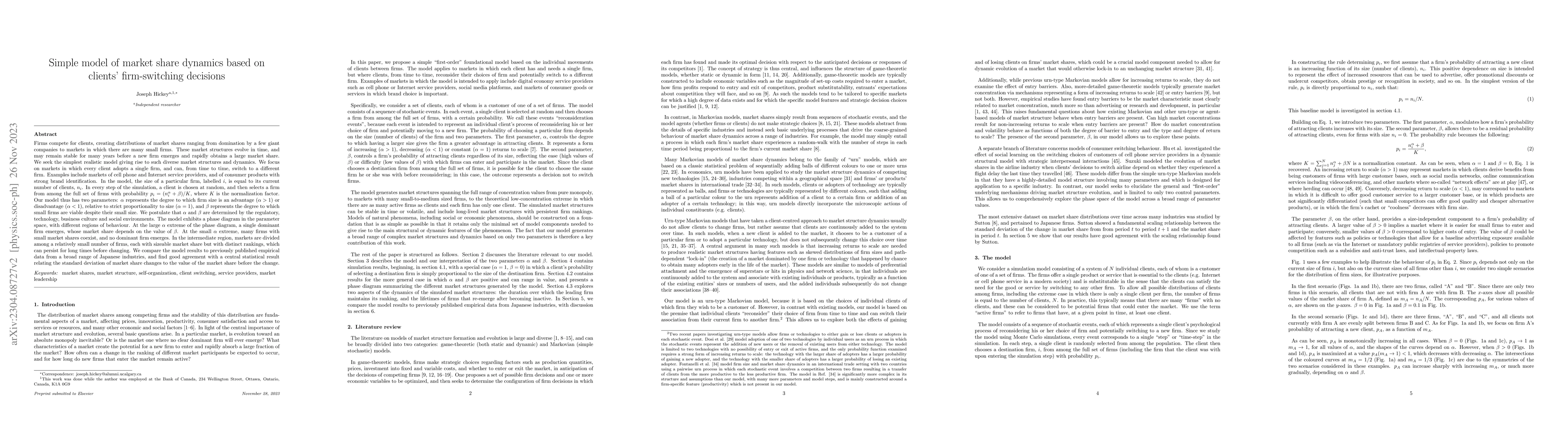 Firms compete for clients, creating distributions of market shares ranging from domination by a few giant companies to markets in which there are many small firms. These market structures evolve in time, and may remain stable for many years before a new firm emerges and rapidly obtains a large market share. We seek the simplest realistic model giving rise to such diverse market structures and dynamics. We focus on markets in which every client adopts a single firm, and can, from time to time, switch to a different firm. Examples include markets of cell phone and Internet service providers, and of consumer products with strong brand identification. In the model, the size of a particular firm, labelled $i$, is equal to its current number of clients, $n_i$. In every step of the simulation, a client is chosen at random, and then selects a firm from among the full set of firms with probability $p_i = (n_i^\alpha + \beta)/K$, where $K$ is the normalization factor. Our model thus has two parameters: $\alpha$ represents the degree to which firm size is an advantage ($\alpha$ > 1) or disadvantage ($\alpha$ < 1), relative to strict proportionality to size ($\alpha$ = 1), and $\beta$ represents the degree to which small firms are viable despite their small size. We postulate that $\alpha$ and $\beta$ are determined by the regulatory, technology, business culture and social environments. The model exhibits a phase diagram in the parameter space, with different regions of behaviour. At the large $\alpha$ extreme of the phase diagram, a single dominant firm emerges, whose market share depends on the value of $\beta$. At the small $\alpha$ extreme, many firms with small market shares coexist, and no dominant firm emerges. In the intermediate region, markets are divided among a relatively small number of firms, each with sizeable market share but with distinct rankings, which can persist for long [...]