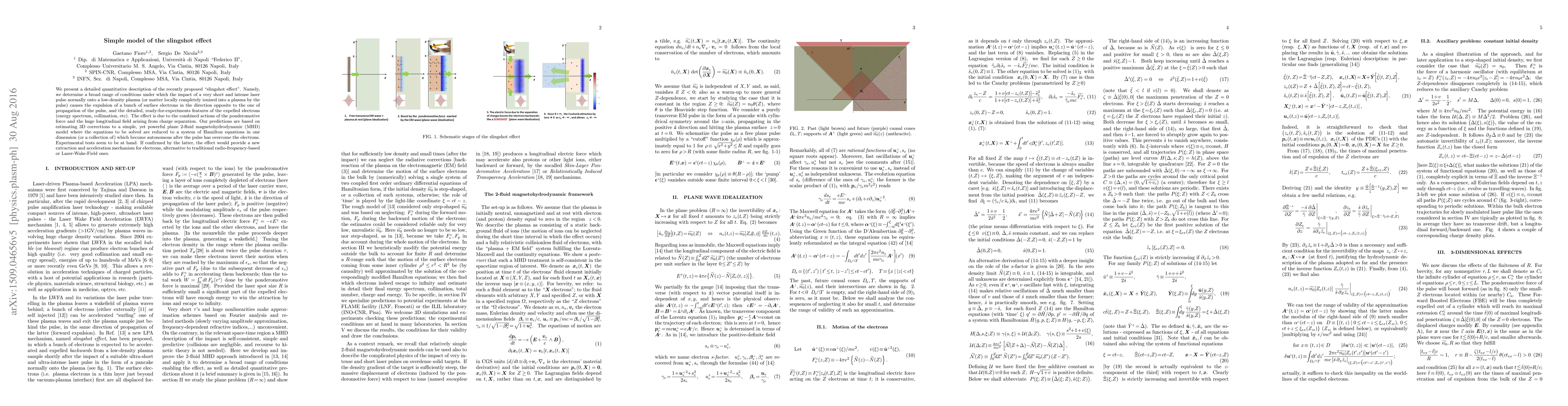We present a detailed quantitative description of the recently proposed "slingshot effect" [Fiore, Fedele, De angelis 2014]. Namely, we determine a broad range of conditions under which the impact of a very short and intense laser pulse normally onto a low-density plasma (or matter to be locally completely ionized into a plasma by the pulse) causes the expulsion of a bunch of surface electrons in the direction opposite to the one of propagation of the pulse, and the detailed, ready-for-experiments features of the expelled electrons (energy spectrum, collimation, etc). The effect is due to the combined actions of the ponderomotive force and the huge longitudinal field arising from charge separation. Our predictions are based on estimating 3D corrections to a simple, yet powerful plane magnetohydrodynamic (MHD) model where the equations to be solved are reduced to a system of Hamilton equations in one dimension (or a collection of) which become autonomous after the pulse has overcome the electrons. Experimental tests seem to be at hand. If confirmed by the latter, the effect would provide a new extraction and acceleration mechanism for electrons, alternative to traditional radio-frequency-based or Laser-Wake-Field ones.