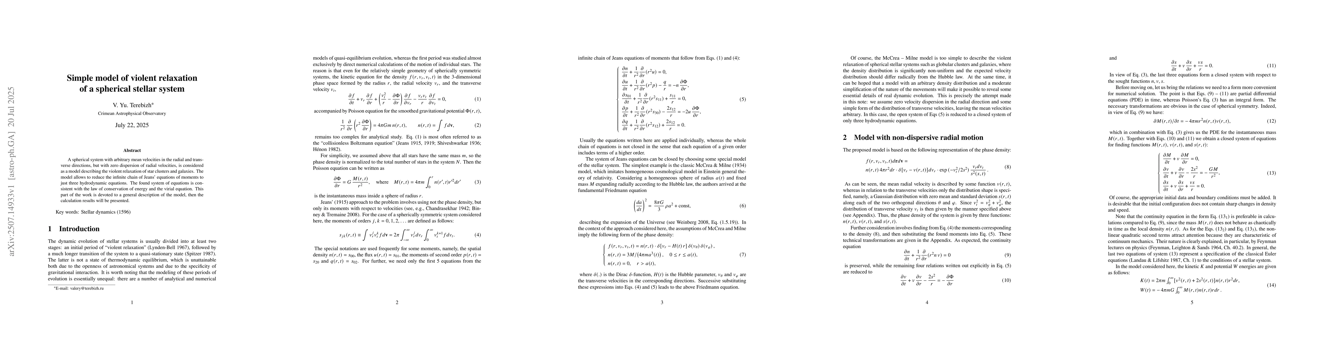 A spherical system with arbitrary mean velocities in the radial and transverse directions, but with zero dispersion of radial velocities, is considered as a model describing the violent relaxation of star clusters and galaxies. The model allows to reduce the infinite chain of Jeans' equations of moments to just three hydrodynamic equations. The found system of equations is consistent with the law of conservation of energy and the virial equation. This part of the work is devoted to a general description of the model, then the calculation results will be presented.