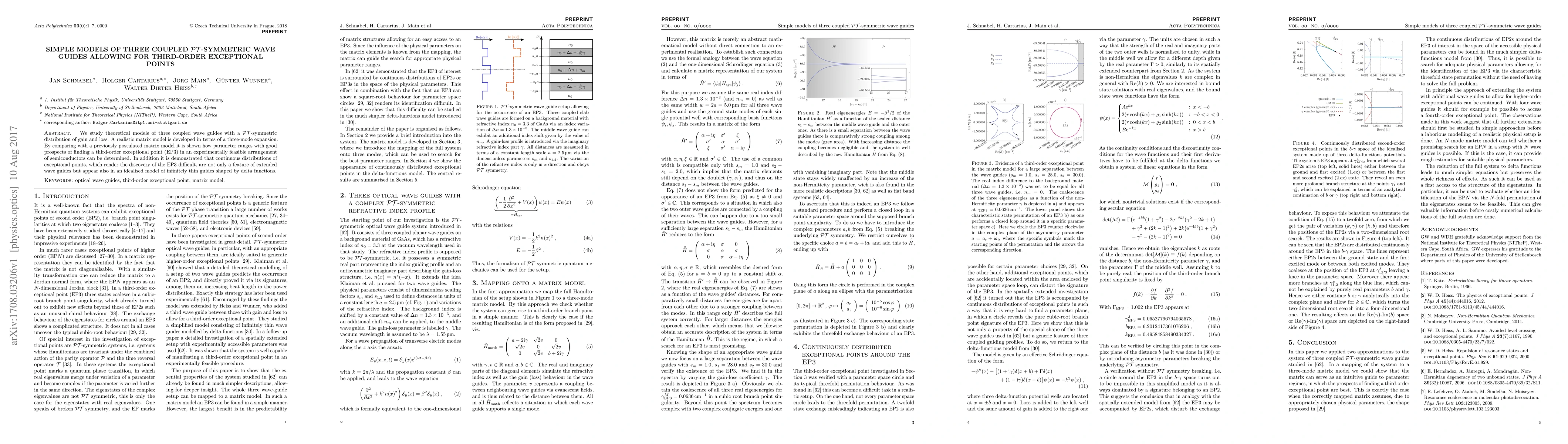 We study theoretical models of three coupled wave guides with a $\mathcal{PT}$-symmetric distribution of gain and loss. A realistic matrix model is developed in terms of a three-mode expansion. By comparing with a previously postulated matrix model it is shown how parameter ranges with good prospects of finding a third-order exceptional point (EP3) in an experimentally feasible arrangement of semiconductors can be determined. In addition it is demonstrated that continuous distributions of exceptional points, which render the discovery of the EP3 difficult, are not only a feature of extended wave guides but appear also in an idealised model of infinitely thin guides shaped by delta functions.