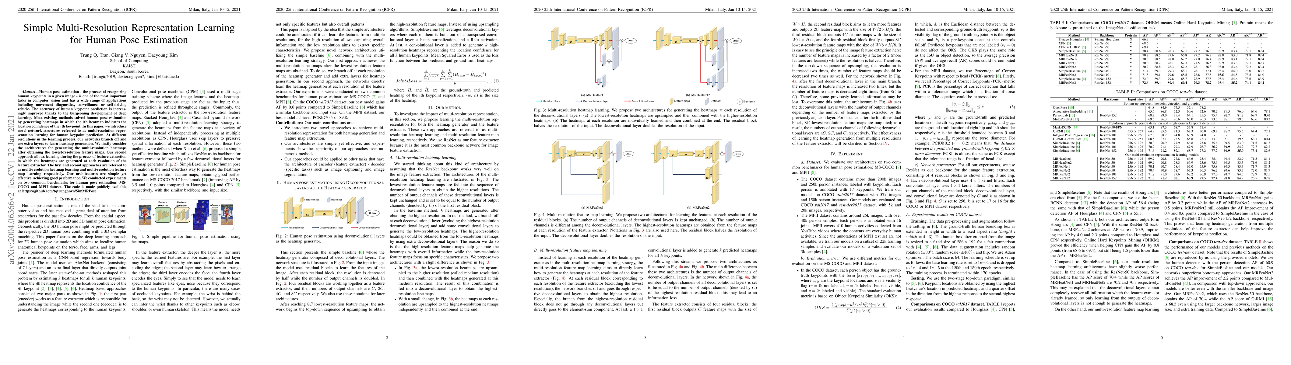 This paper proposes simple yet effective multi-resolution network structures for human pose estimation, achieving improved accuracy through heatmap generation at different resolutions. Experiments on MSCOCO and MPII datasets demonstrate the effectiveness of the proposed methods.