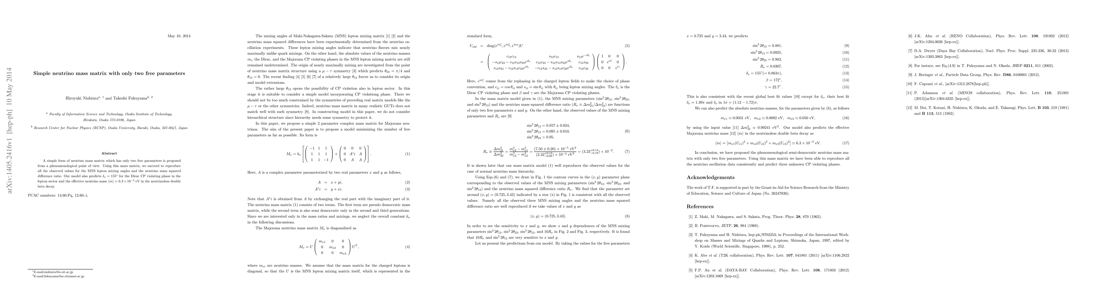 A simple form of neutrino mass matrix which has only two free parameters is proposed from a phenomenological point of view. Using this mass matrix, we succeed to reproduce all the observed values for the MNS lepton mixing angles and the neutrino mass squared difference ratio. Our model also predicts $\delta_{\nu}= 155^\circ$ for the Dirac CP violating phase in the lepton sector and the effective neutrino mass $\langle m \rangle=6.3\times 10^{-3}$ eV in the neutrinoless double beta decay.