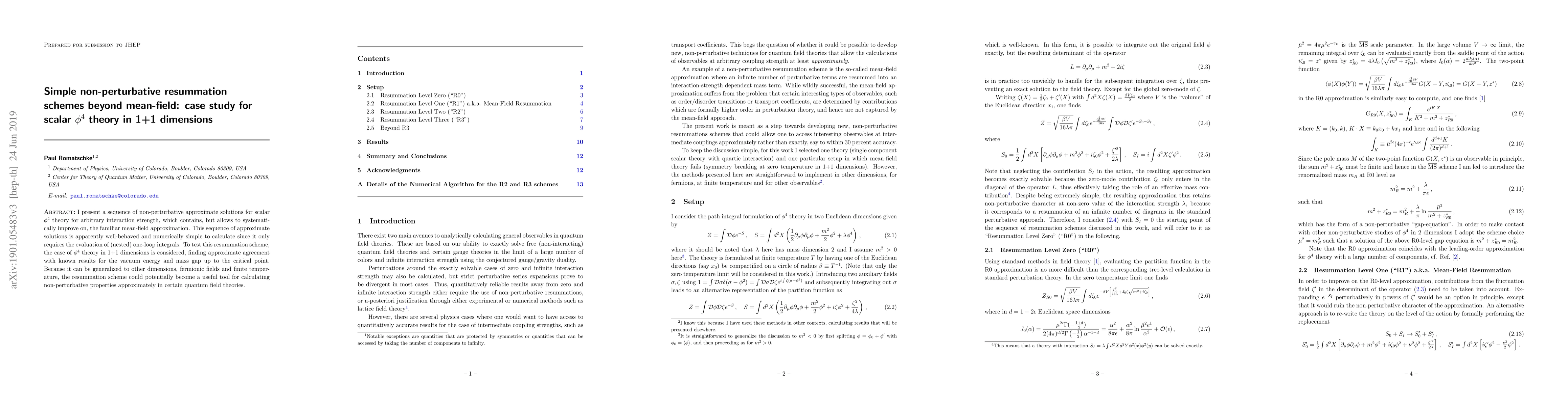 This paper introduces a non-perturbative resummation scheme for scalar $\phi^4$ theory in 1+1 dimensions that systematically improves upon mean-field approximations. The method, which involves evaluating nested one-loop integrals, shows approximate agreement with known results for vacuum energy and mass gap, suggesting its potential utility for other quantum field theories.