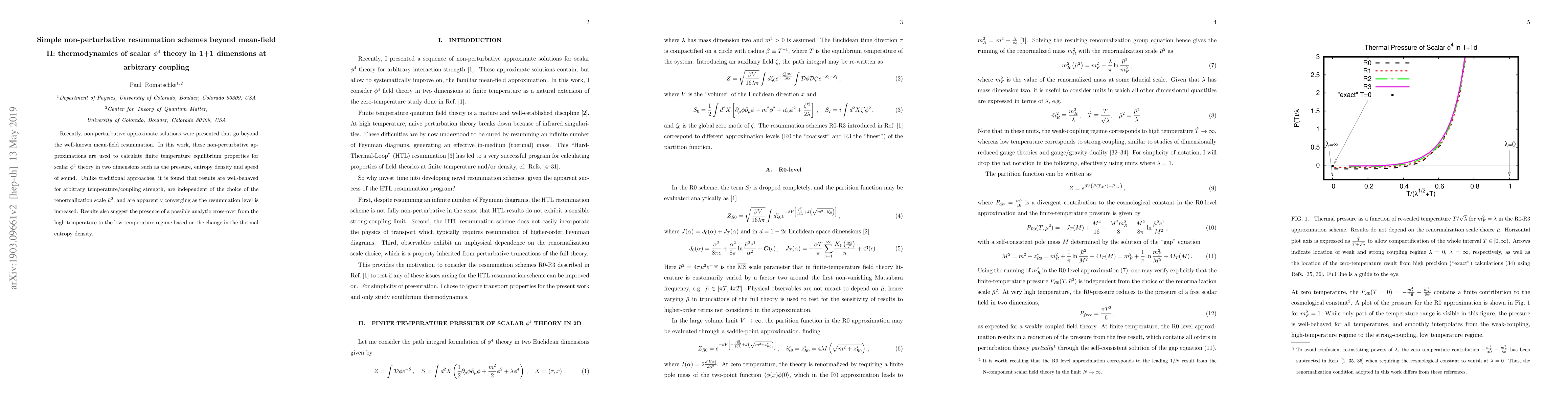 This paper presents non-perturbative resummation schemes for scalar $\phi^4$ theory in 1+1 dimensions, calculating thermodynamic properties like pressure, entropy, and sound speed at finite temperatures. Unlike traditional methods, these approximations yield well-behaved results across all temperatures and coupling strengths, independent of the renormalization scale.