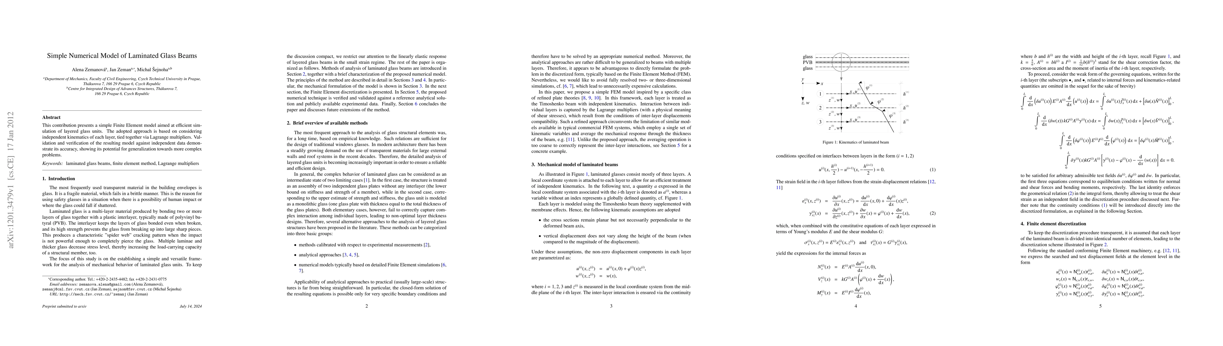 This paper introduces a straightforward Finite Element model for simulating laminated glass beams, employing independent layer kinematics and Lagrange multipliers for inter-layer coupling. The model's accuracy is validated against independent data, indicating its potential for broader application.