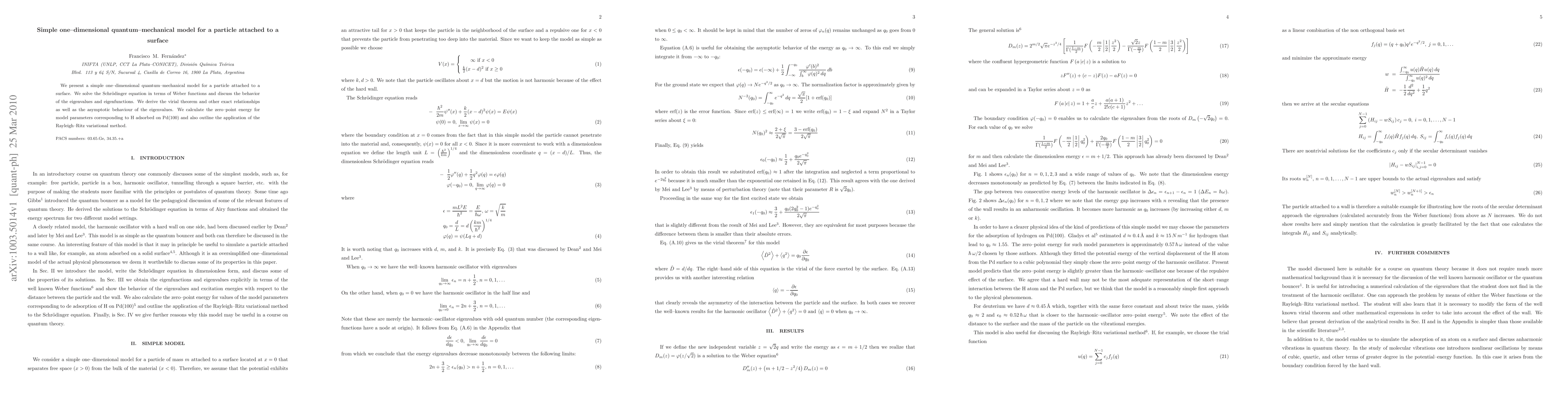 A simple quantum model is developed for a particle attached to a surface, with key findings including exact relationships between eigenvalues and eigenfunctions, zero-point energy calculations, and application of the Rayleigh-Ritz variational method.