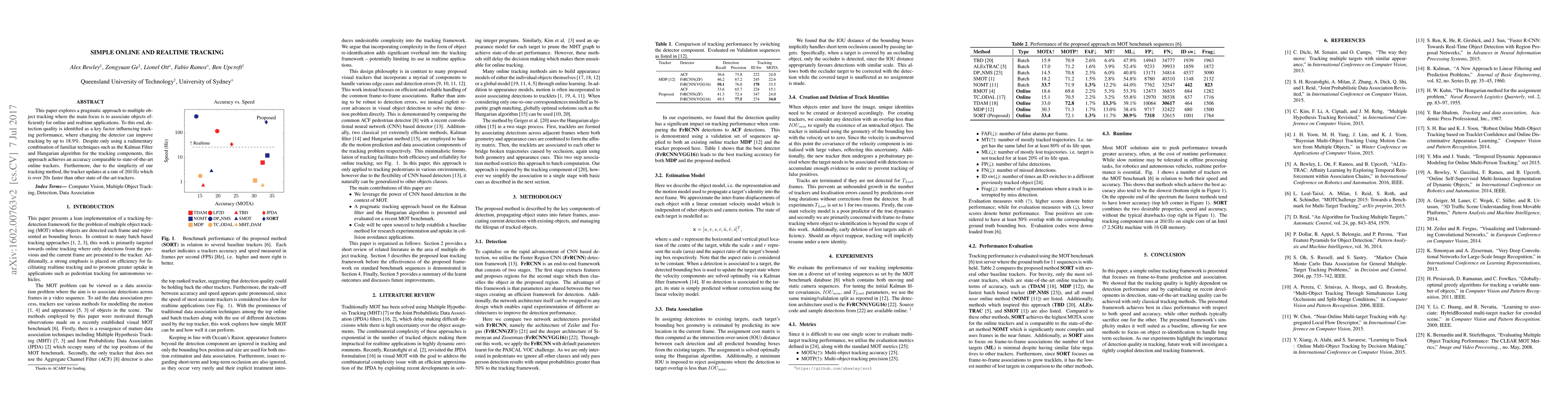 The paper presents a simple yet effective online tracking framework (SORT) that combines recent CNN-based detection with classical tracking methods (Kalman filter and Hungarian algorithm), achieving high accuracy and real-time performance.