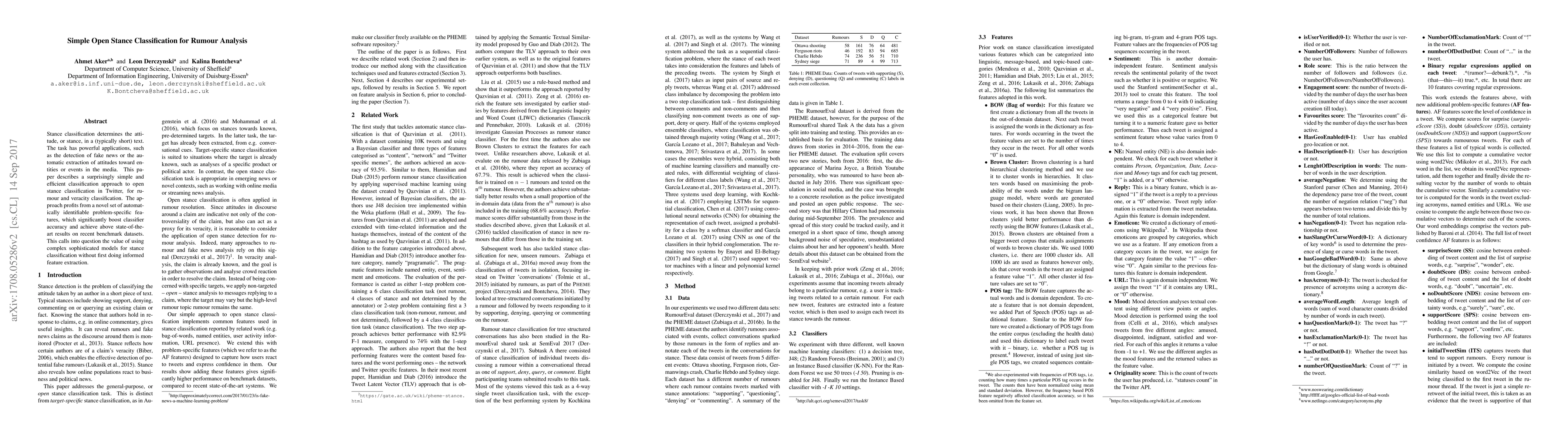 This paper proposes a simple yet effective method for open stance classification on Twitter to analyze rumours and veracity, utilizing a set of automatically identifiable features that outperform state-of-the-art models, suggesting that complex models may not always be necessary when informed feature extraction is applied.