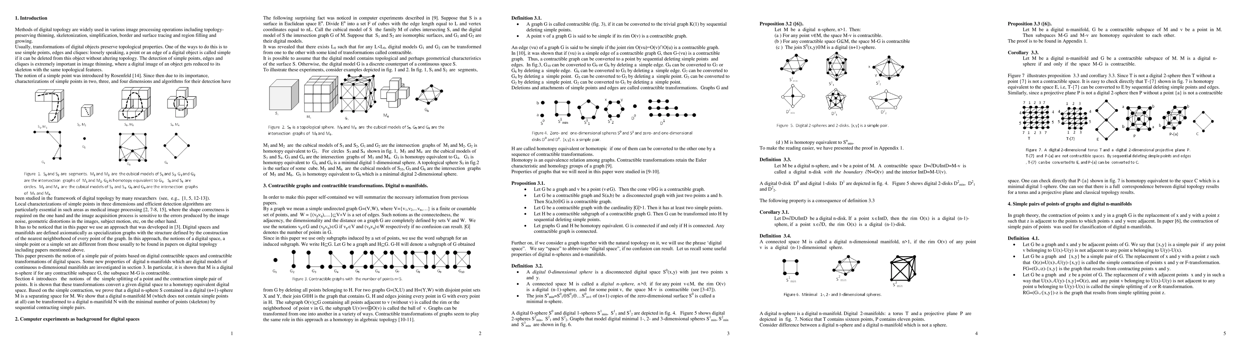 This paper explores topology-preserving transformations in digital spaces through the contraction of simple pairs of points, demonstrating that such contractions maintain both local and global topology. It also investigates the properties of digital manifolds, showing that they can be simplified to their minimal form via sequential contractions. Keywords: Graph, digital space, contraction, splitting, simple pair, homotopy, thinning