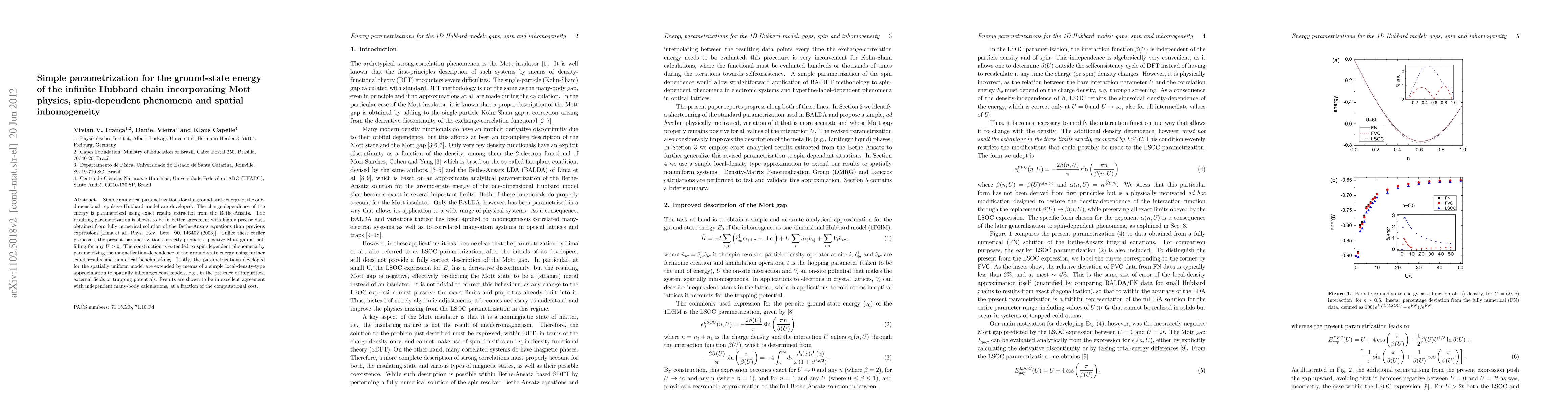 Simple analytical parametrizations for the ground-state energy of the one-dimensional repulsive Hubbard model are developed. The charge-dependence of the energy is parametrized using exact results extracted from the Bethe-Ansatz. The resulting parametrization is shown to be in better agreement with highly precise data obtained from fully numerical solution of the Bethe-Ansatz equations than previous expressions [Lima et al., Phys. Rev. Lett. 90, 146402 (2003)]. Unlike these earlier proposals, the present parametrization correctly predicts a positive Mott gap at half filling for any U>0. The construction is extended to spin-dependent phenomena by parametrizing the magnetization-dependence of the ground-state energy using further exact results and numerical benchmarking. Lastly, the parametrizations developed for the spatially uniform model are extended by means of a simple local-density-type approximation to spatially inhomogeneous models, e.g., in the presence of impurities, external fields or trapping potentials. Results are shown to be in excellent agreement with independent many-body calculations, at a fraction of the computational cost.