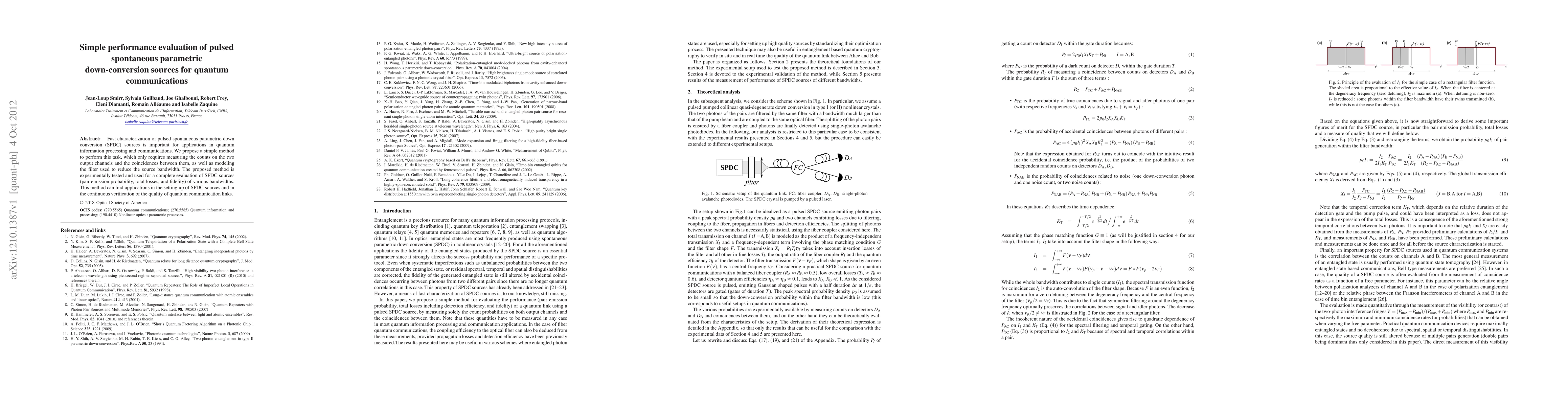 Fast and complete characterization of pulsed spontaneous parametric down conversion (SPDC) sources is important for applications in quantum information processing and communications. We propose a simple method to perform this task, which only requires measuring the counts on the two output channels and the coincidences between them, as well as modeling the filter used to reduce the source bandwidth. The proposed method is experimentally tested and used for a complete evaluation of SPDC sources (pair emission probability, total losses, and fidelity) of different bandwidths. This method can find applications in the setting up of SPDC sources and in the continuous verification of the quality of quantum communication links.
