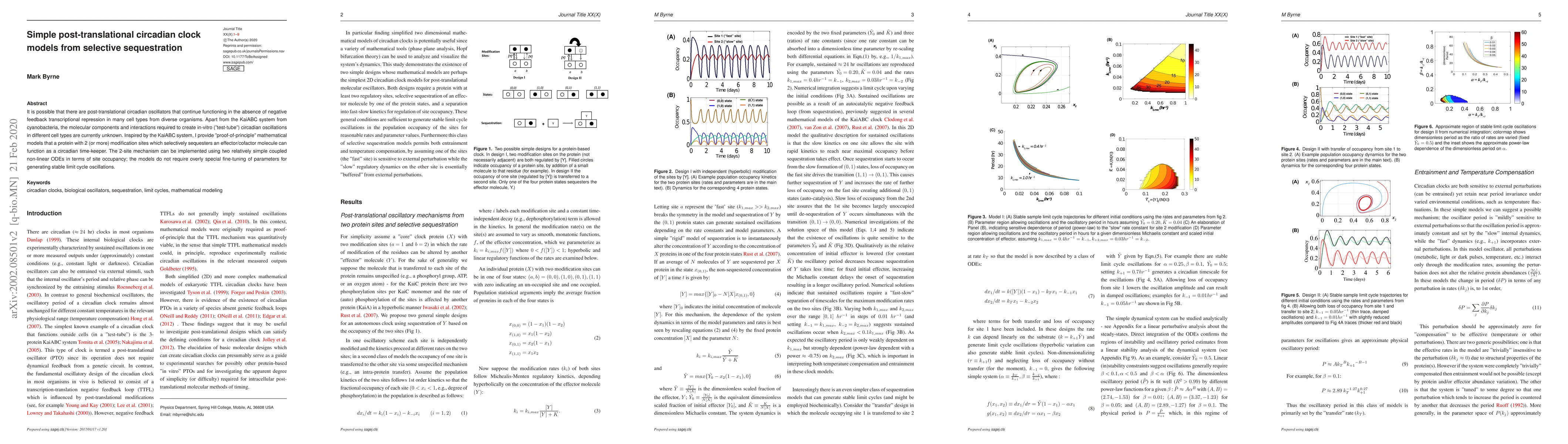 It is possible that there are post-translational circadian oscillators that continue functioning in the absence of negative feedback transcriptional repression in many cell types from diverse organisms. Apart from the KaiABC system from cyanobacteria, the molecular components and interactions required to create in-vitro ("test-tube") circadian oscillations in different cell types are currently unknown. Inspired by the KaiABC system, I provide "proof-of-principle" mathematical models that a protein with 2 (or more) modification sites which selectively sequesters an effector/cofactor molecule can function as a circadian time-keeper. The 2-site mechanism can be implemented using two relatively simple coupled non-linear ODEs in terms of site occupancy; the models do not require overly special fine-tuning of parameters for generating stable limit cycle oscillations.