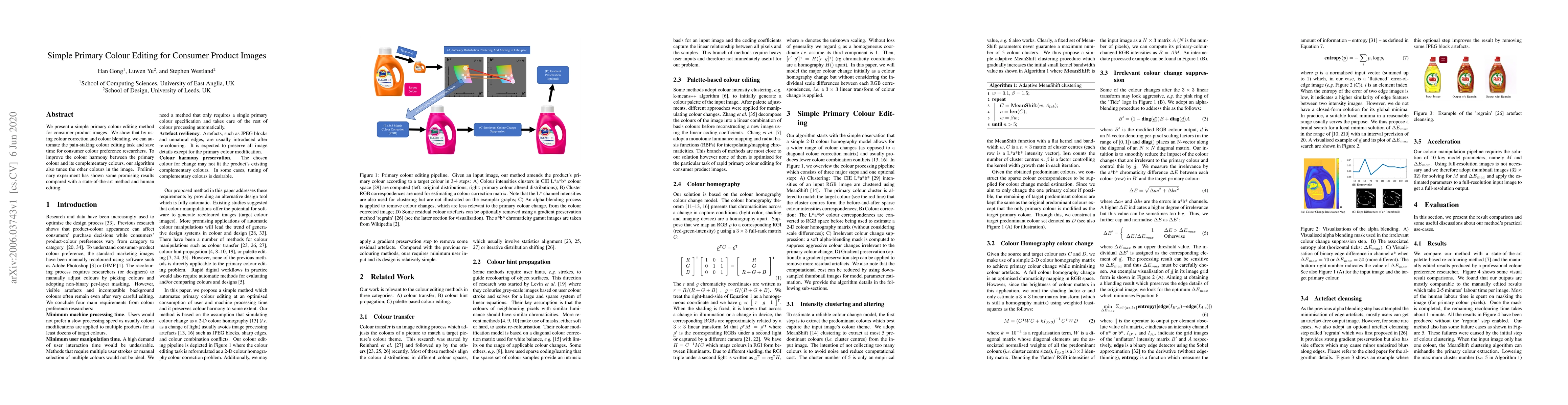 This paper introduces a method for automating primary colour editing in consumer product images through colour correction and blending, aiming to save time for researchers. The algorithm also adjusts complementary colours to enhance harmony, showing promising results against both state-of-the-art methods and human editing.