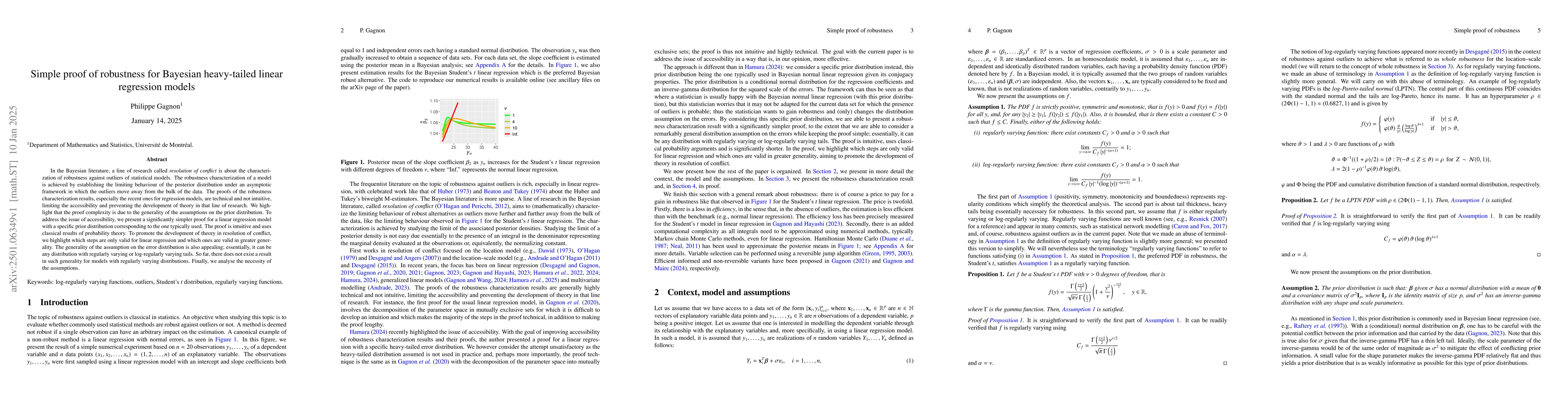 This paper presents a simpler, intuitive proof of robustness for Bayesian heavy-tailed linear regression models, addressing technical complexities in previous proofs. It emphasizes the generality of assumptions on the error distribution and highlights model-specific versus more broadly applicable proof steps.